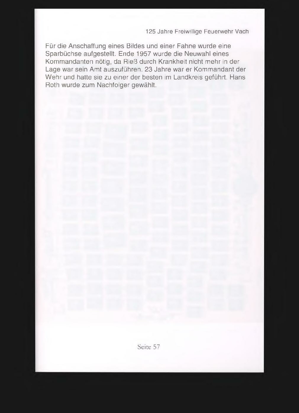 Für die Anschaffung eines Bildes und einer Fahne wurde eine Sparbüchse aufgestellt. Ende 1957 wurde die Neuwahl eines Kommandanten nötig, da Rieß durch Krankheit nicht mehr in der Lage war sein Amt auszuführen. 23 Jahre war er Kommandant der Wehr und hatte sie zu einer der besten im Landkreis geführt. Hans Roth wurde zum Nachfolger gewählt.