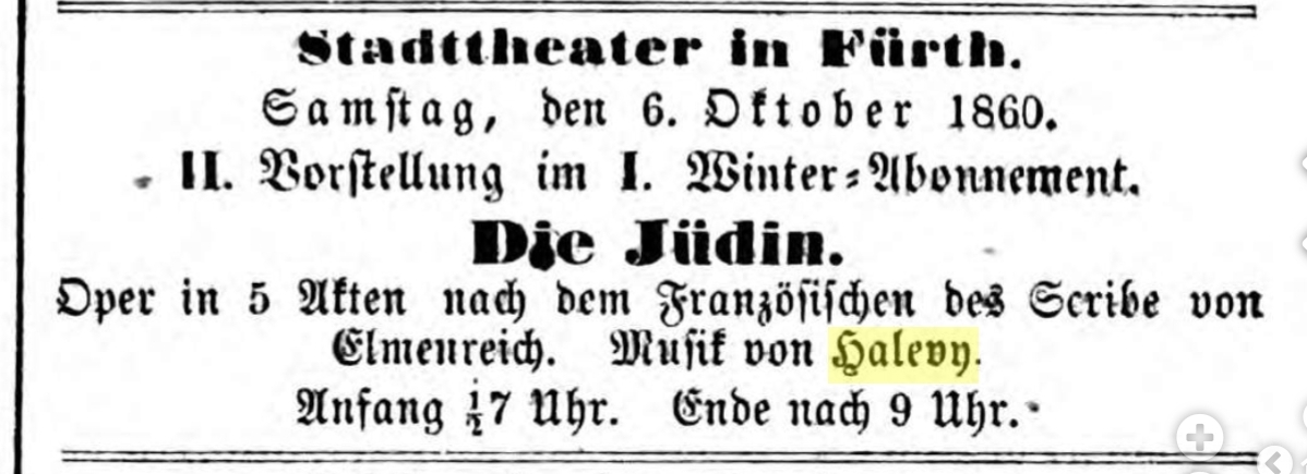 | Dateiinfo (Bild-Unterschrift und Info-Box, automatisch erstellt) | Ankündigung "Die Jüdin" von Halevy Urheber: Fürther Tagblatt<br><br>Lizenz: CC BY-SA 3.0 | ||