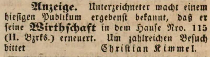 Zeitungsanzeige des Wirts Christian Kimmel bzgl. Wirtschaftseröffnung, Januar 1847 Erstellungsdatum: Januar 1847<br>Lizenz: noc-nc-1.0