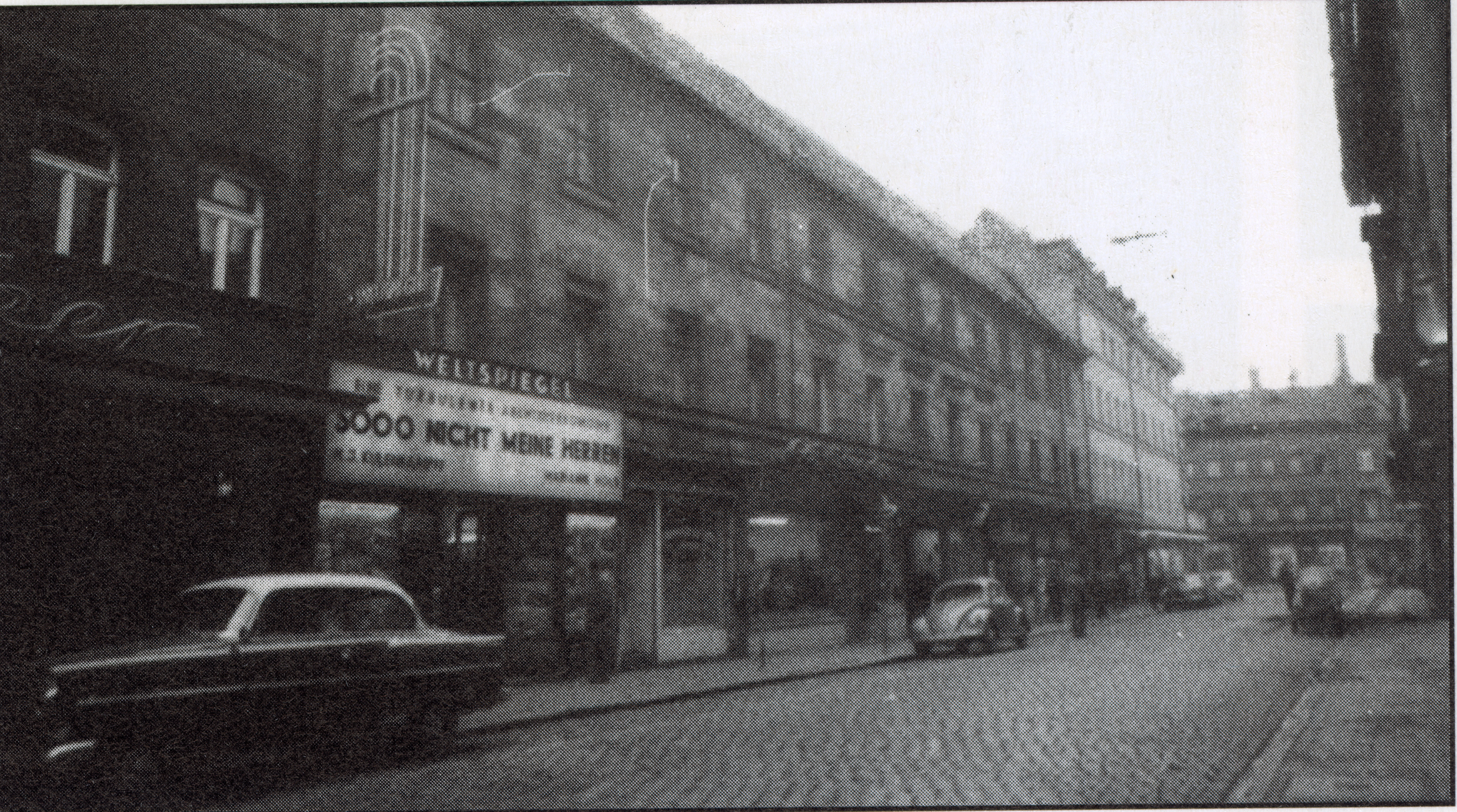 | Dateiinfo (Bild-Unterschrift und Info-Box, automatisch erstellt) | Kino "Weltspiegel", Ende 50er Urheber: unbekannt<br>Lizenz: CC BY-SA 3.0 | ||