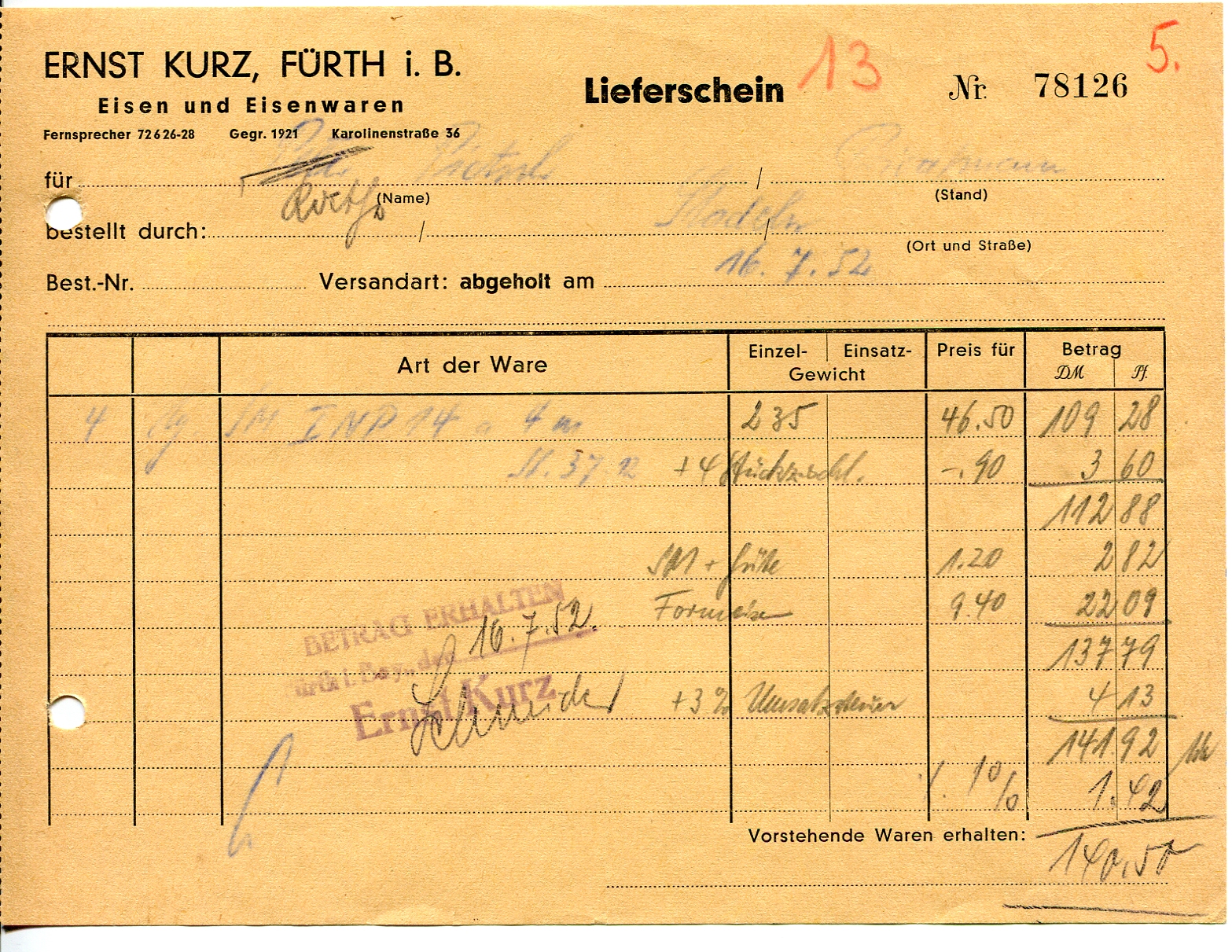 | Beschreibung | Rechnung von 1952 der Eisenwarenfirma Ernst Kurz in der Karolinenstraße 36 | ||
