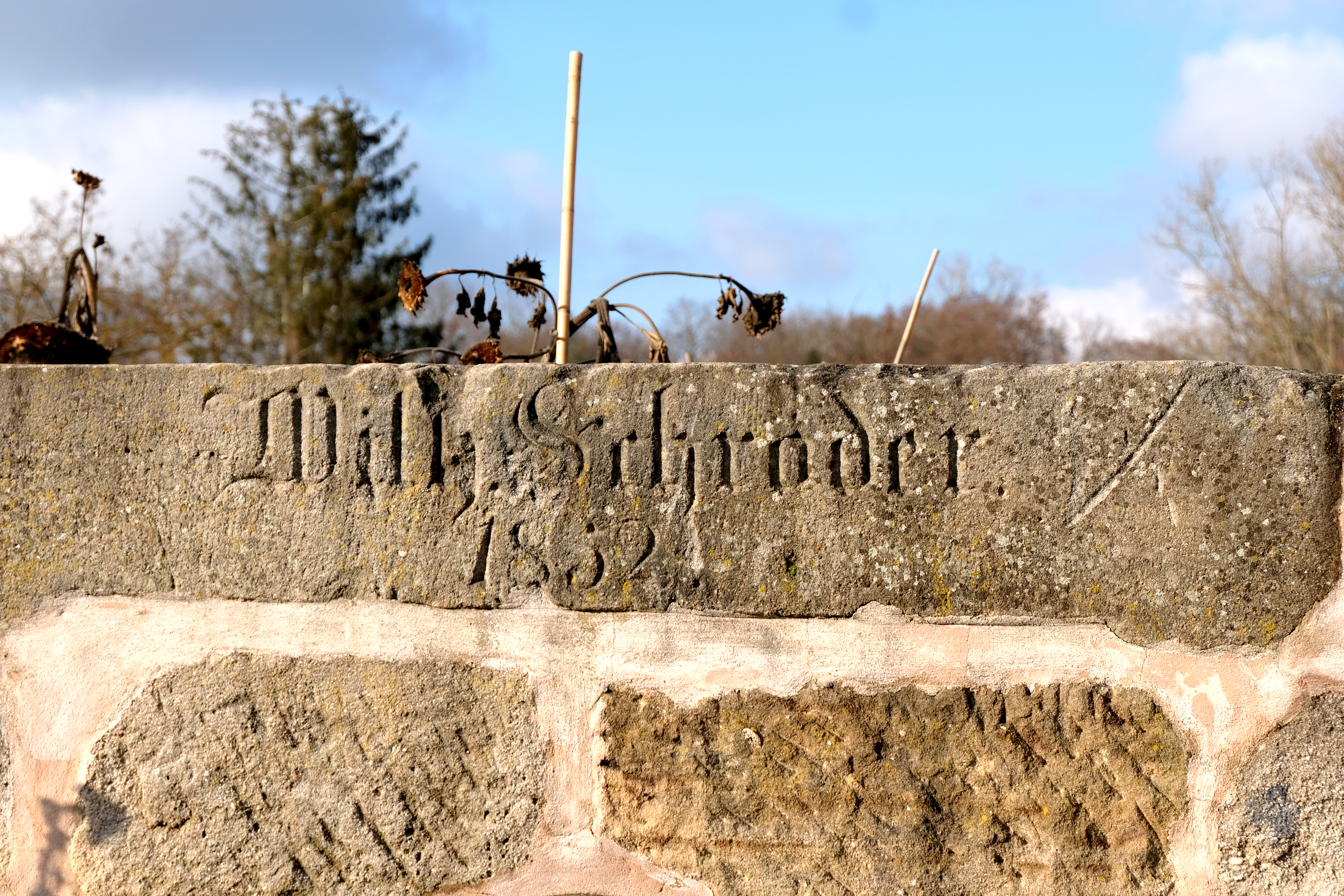 | Beschreibung | Inschrift an der Mauer des ehem. Stadelhof in der Vacher Straße 222: Wilhl. Schröder 1832, Jan 2021 | ||