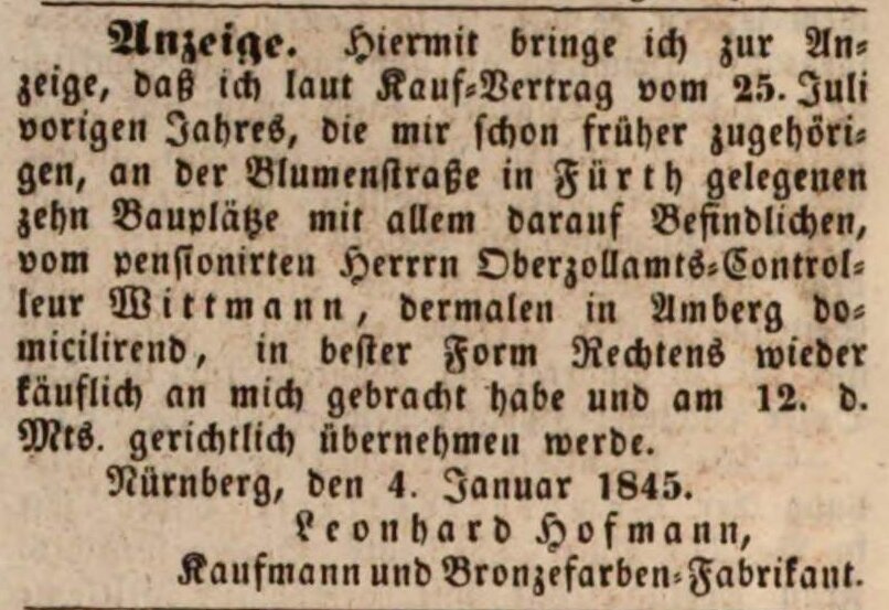 | Beschreibung | Zeitungsanzeige des Bronzefarbenfabrikanten Leonhard Hofmann, Januar 1845 | ||