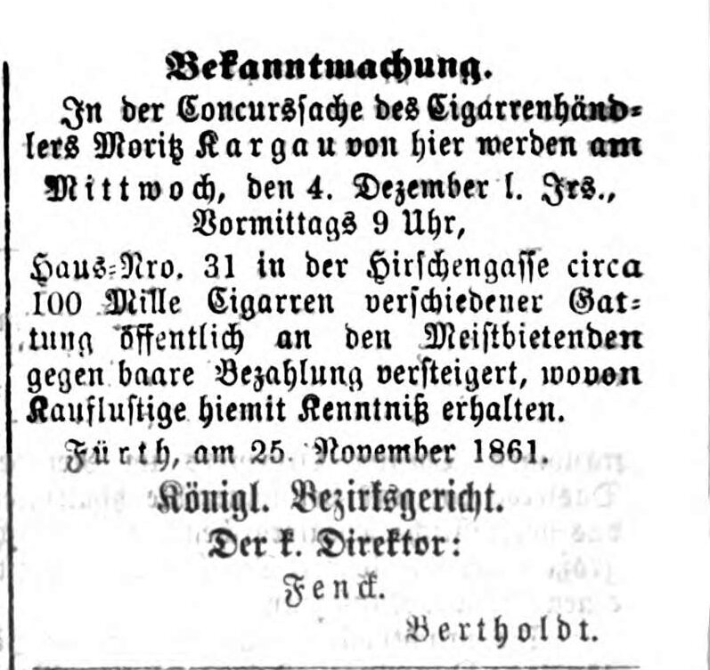 | Beschreibung | Konkursverfahren Moritz Kargau, Fürther Tagblatt 29. November 1861 | ||