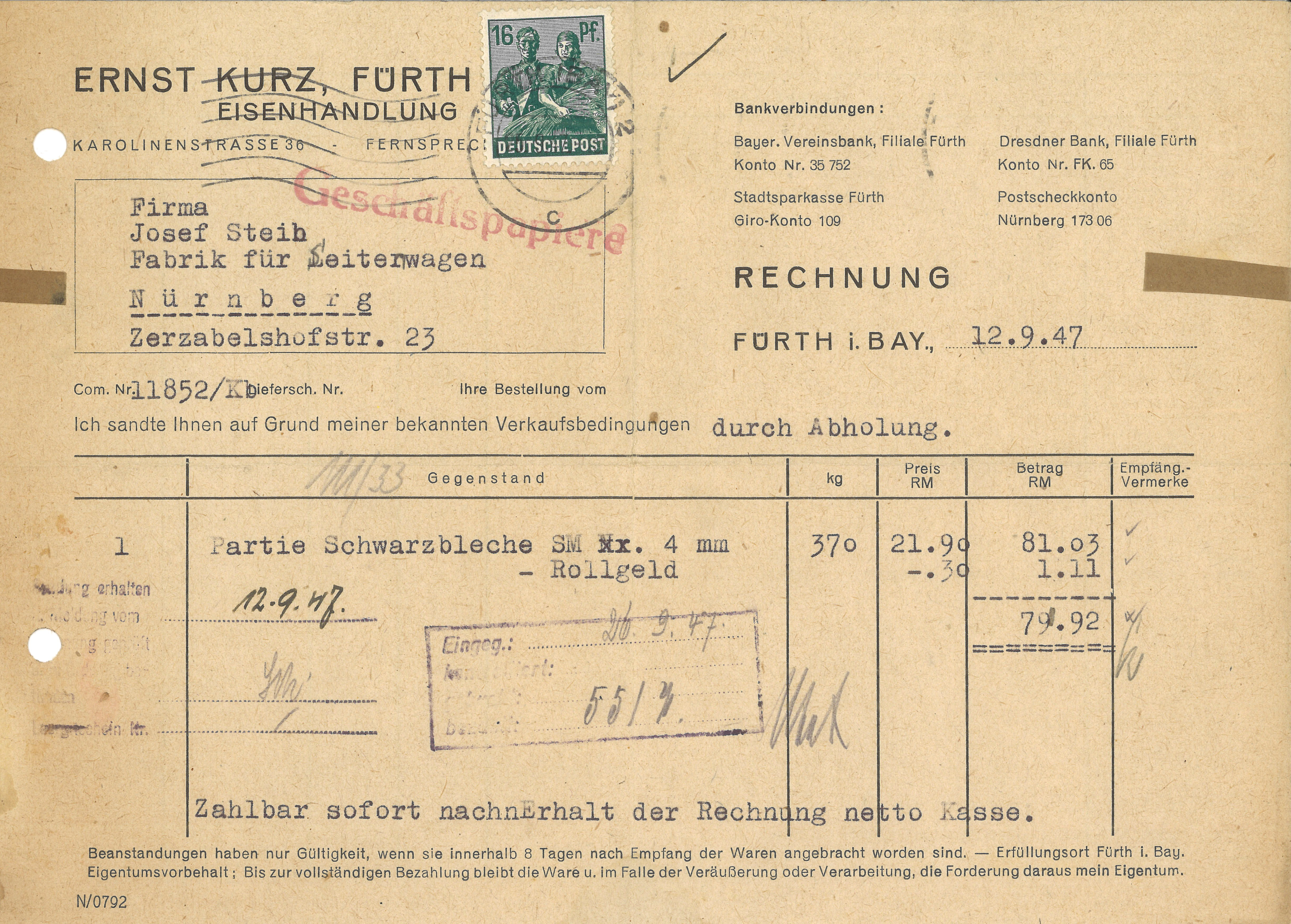 | Beschreibung | Historische Rechnung der Eisenhandlung Ernst Kurz über eine Lieferung Bleche für die bekannte Nürnberger Seitenwagenmanufaktur Steib | ||