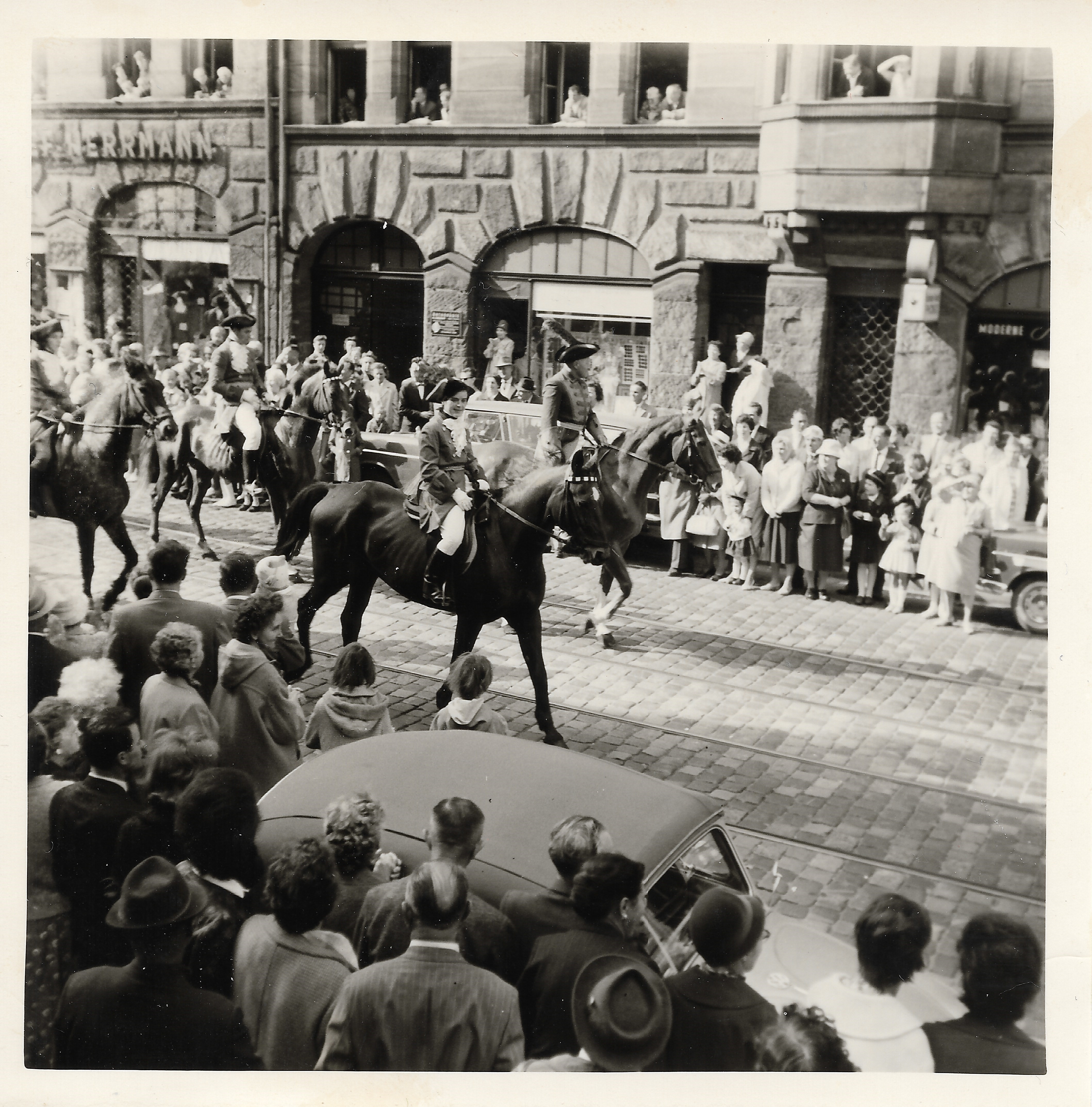 | Beschreibung | Erntedankfestzug in der Schwabacher Straße, 1962 | ||