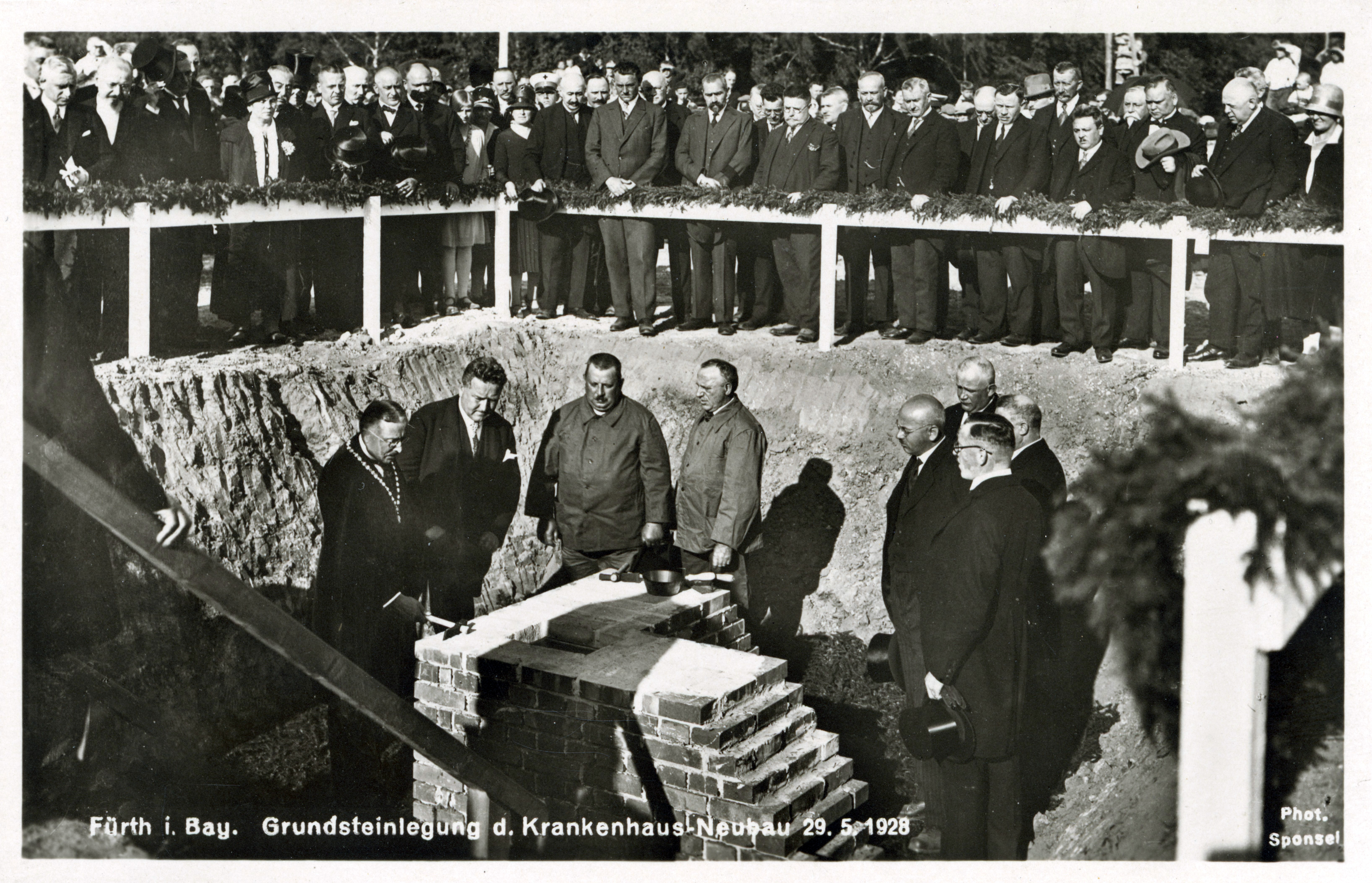 | Beschreibung | Grundsteinlegung des neuen Krankenhauses auf der Schwand, in der Baugrube links OB Robert Wild und Baureferent Herrmann Herrenberger, oben links im Publikum Dr. Jakob Frank und Stadträtin Babette Bauer, Mai 1928 | ||
