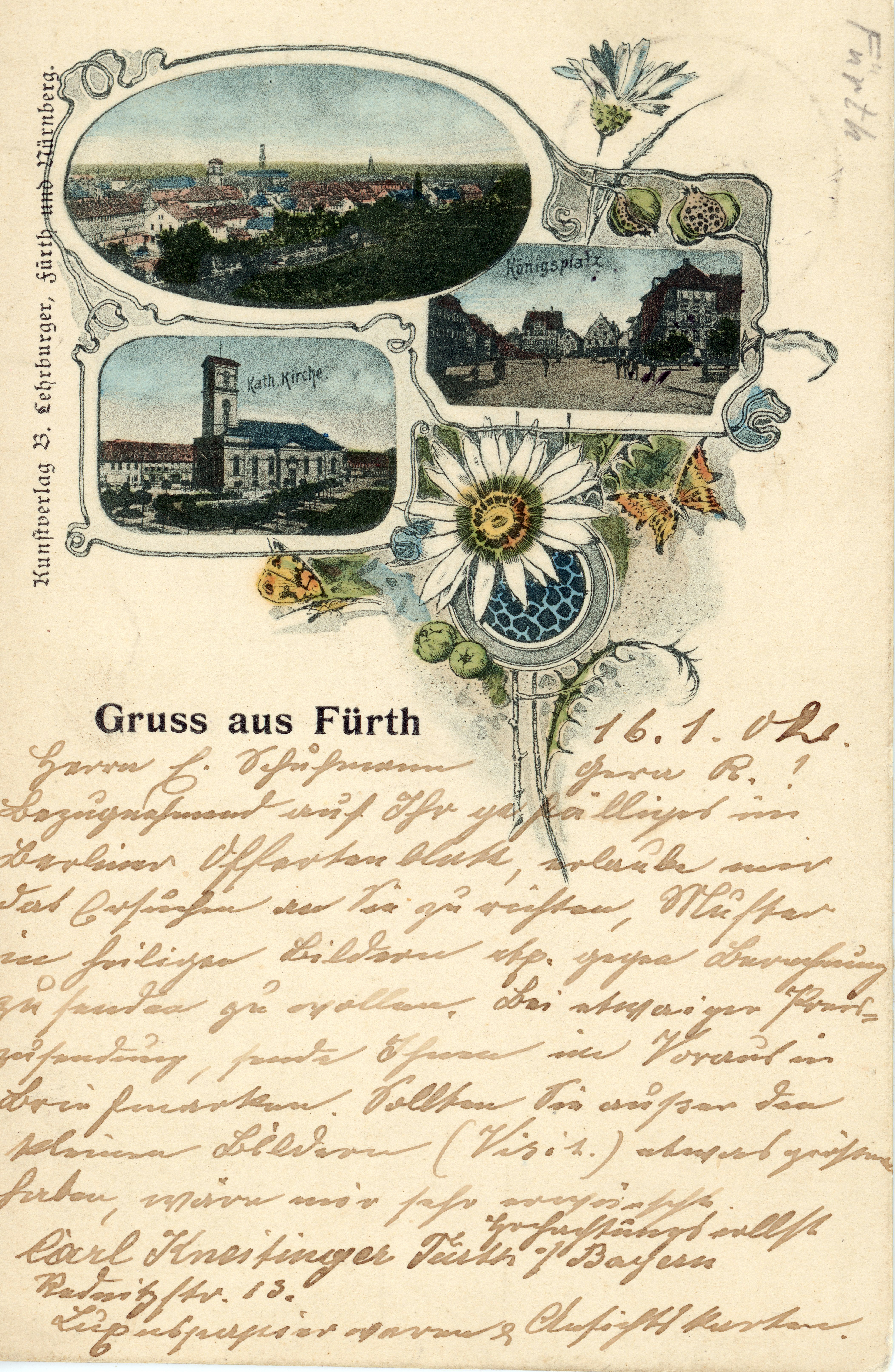 | Dateiinfo (Bild-Unterschrift und Info-Box, automatisch erstellt) | Ansichtkarte mit Motiven aus Fürth und Edelweiss, gel. Jan 1902 Urheber: Kunstverlag B. Lehrburger<br><br>Lizenz: CC BY-SA 4.0 | ||