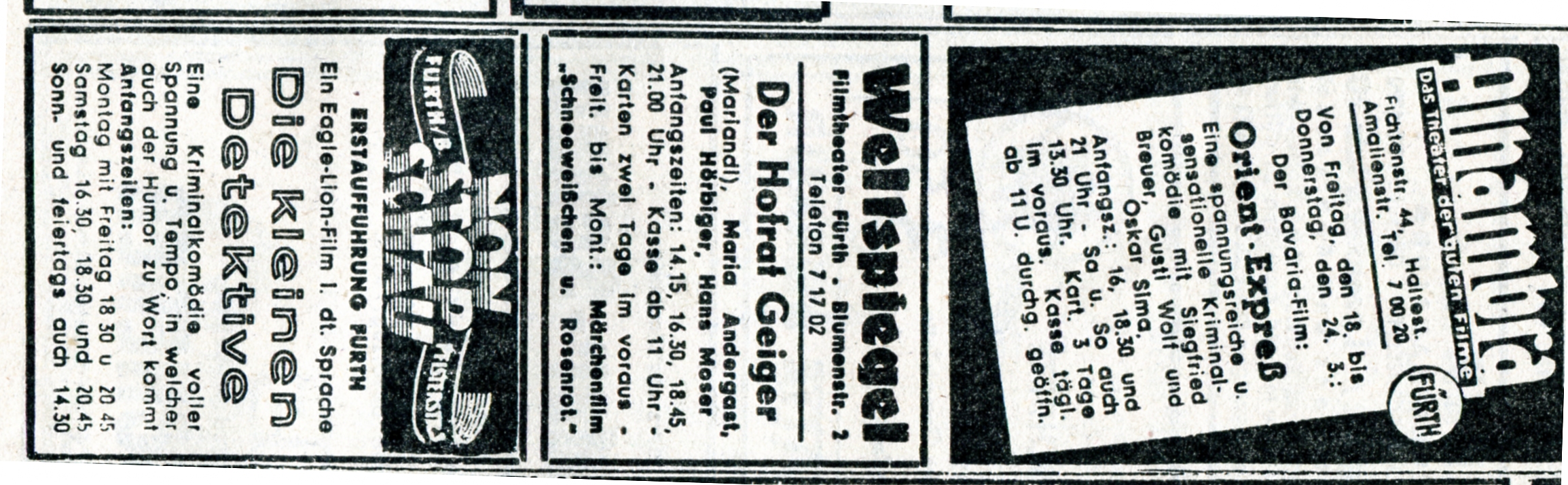 | Dateiinfo (Bild-Unterschrift und Info-Box, automatisch erstellt) | Kino-Anzeige in den FN vom 19. März 1949 Urheber: Fürther Nachrichten<br>Erstellungsdatum: 19. März 1949<br>Lizenz: cc-by-sa-3.0 | ||