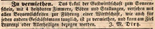 | Dateiinfo (Bild-Unterschrift und Info-Box, automatisch erstellt) | Vermietung der Gaststätte zum Sonnenschein, März 1840 Lizenz: noc-nc-1.0 | ||