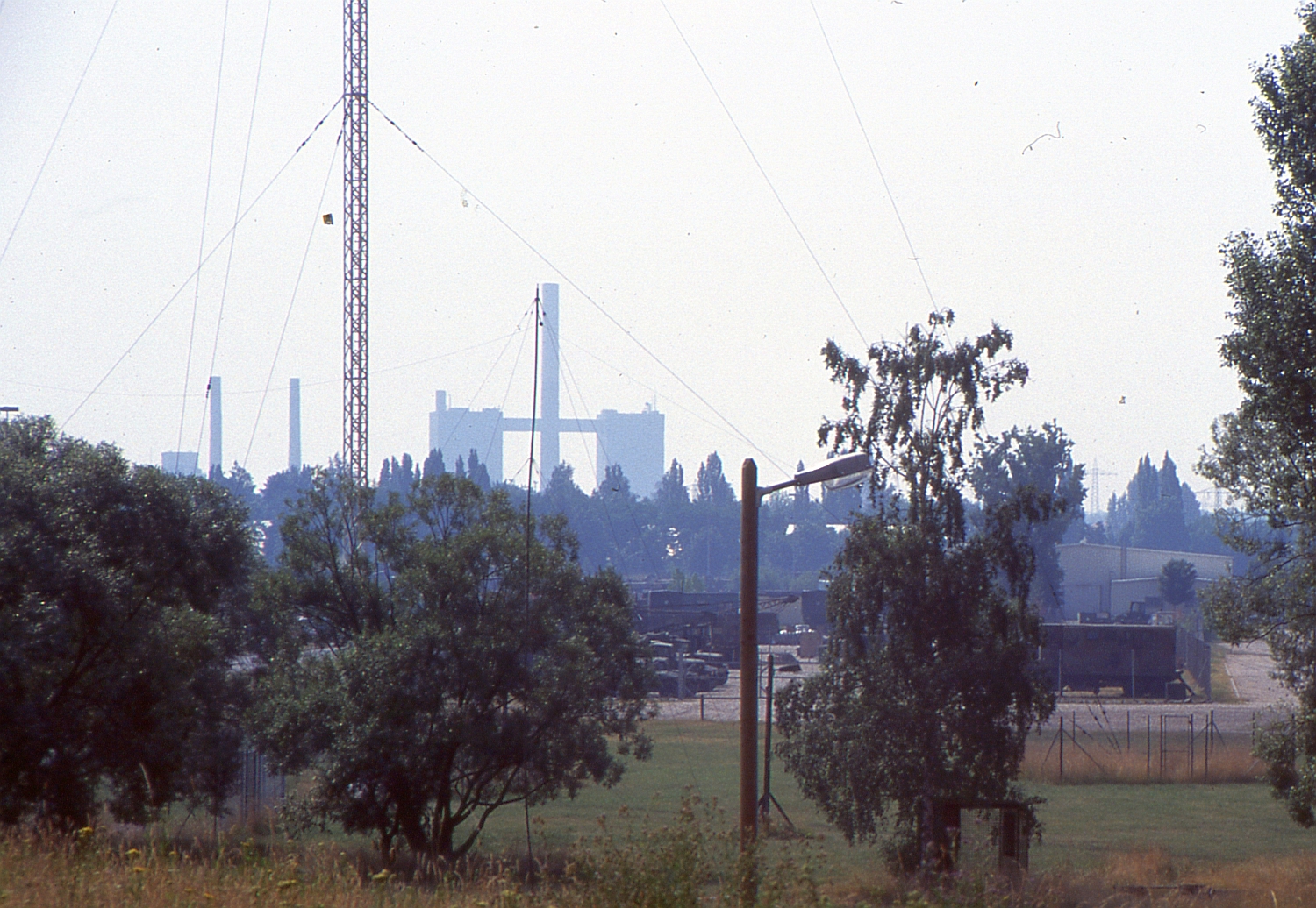 | Beschreibung | Der MW-Sendemast in der Johnson Barracks. Im Hintergrund das Großkraftwerk Franken (1994) | ||