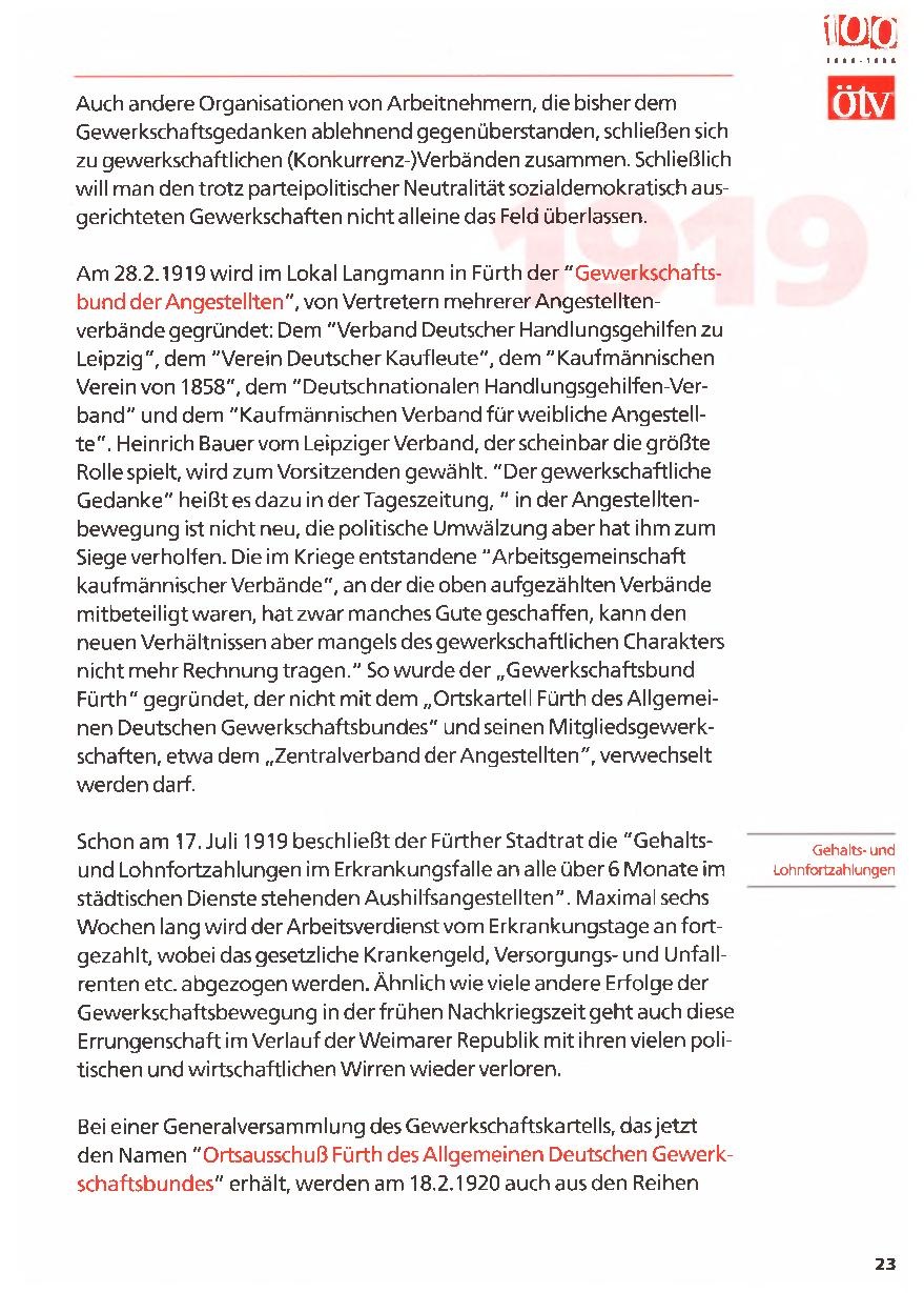 Am 28.2.1919 wird im Lokal Langmann in Fürth der "Gewerkschaftsbund der Angestellten", von Vertretern mehrerer Angestelltenverbände gegründet: Dem "Verband Deutscher Handlungsgehilfen zu Leipzig", dem "Verein Deutscher Kaufleute", dem "Kaufmännischen Verein von 1858", dem "Deutschnationalen Handlungsgehilfen-Verband" und dem "Kaufmännischen Verband für weibliche Angestellte". Heinrich Bauer vom Leipziger Verband, der scheinbar die größte Rolle spielt, wird zum Vorsitzenden gewählt. "Der gewerkschaftliche Gedanke" heißt es dazu in der Tageszeitung, " in der Angestelltenbewegung ist nicht neu, die politische Umwälzung aber hat ihm zum Siege verholten. Die im Kriege entstandene "Arbeitsgemeinschaft kaufmännischer Verbände", an der die oben aufgezählten Verbände mitbeteiligt waren, hat zwar manches Gute geschaffen, kann den neuen Verhältnissen aber mangels des gewerkschaftlichen Charakters nicht mehr Rechnung tragen." So wurde der „Gewerkschaftsbund Fürth" gegründet, der nicht mit dem „Ortskartell Fürth des Allgemeinen Deutschen Gewerkschaftsbundes" und seinen Mitgliedsgewerkschaften, etwa dem „Zentralverband der Angestellten", verwechselt werden darf.