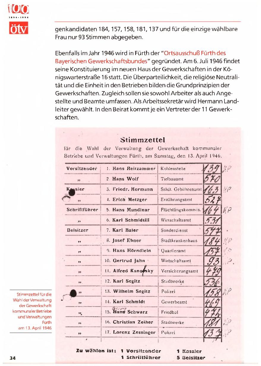 für die Wahl der Verwaltung der Gewerkschaft kommunaler Betriebe und Verwaltungen Fürth, am Samstag, den 13. April 1946.
