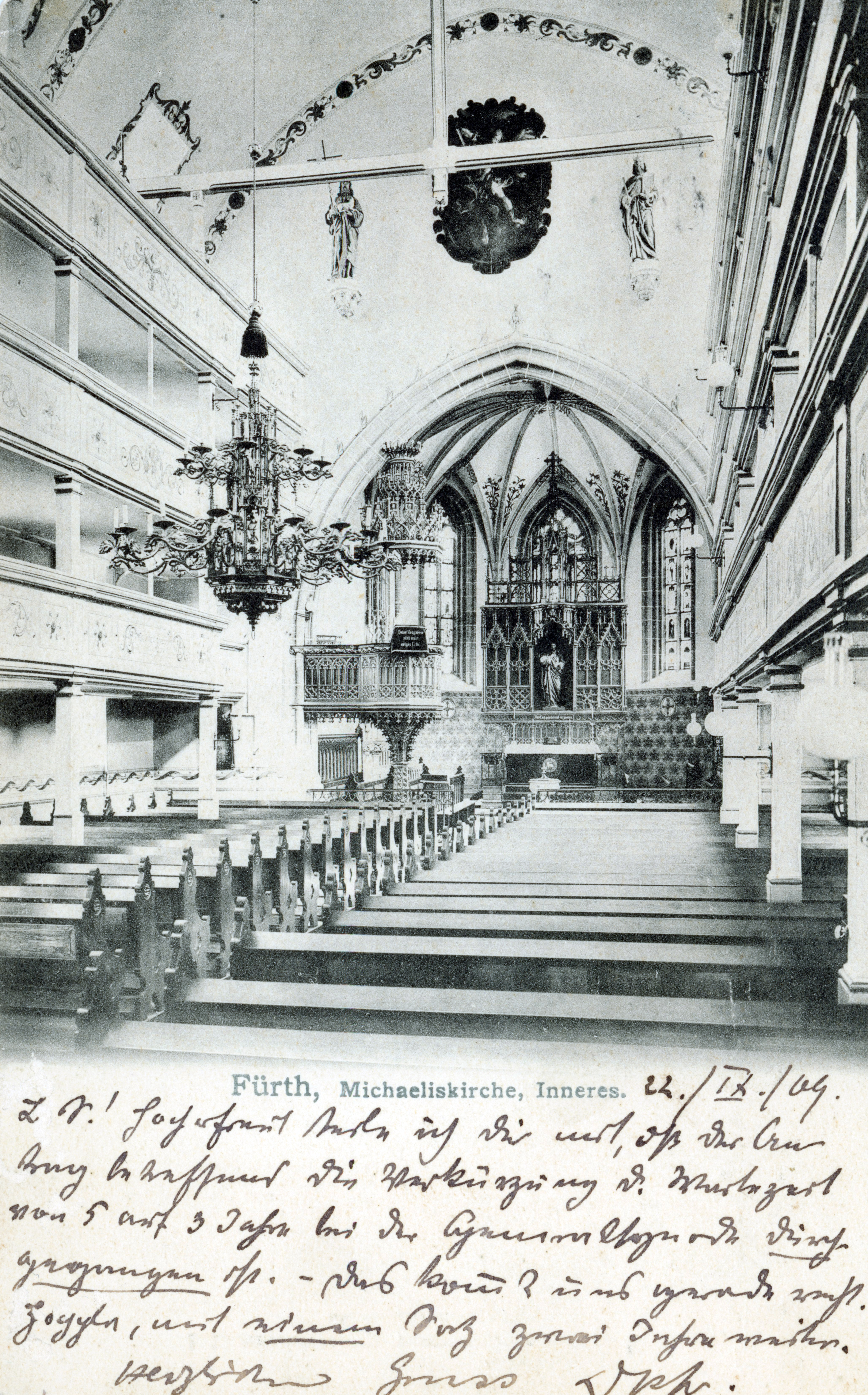 | Beschreibung | Blick in den Innenraum der Michaeliskirche, gel. Sept 1909 | ||