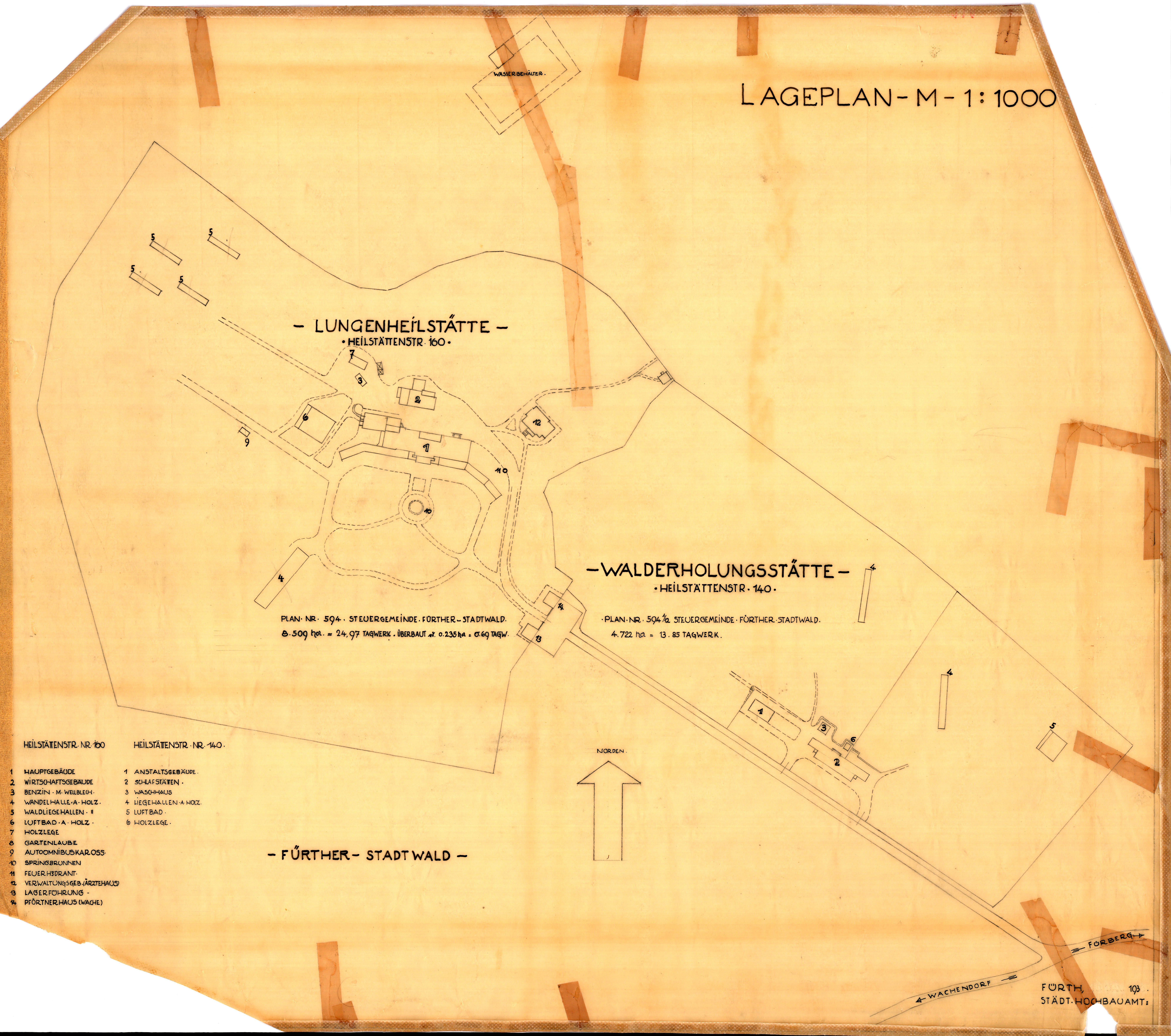 Lageplan im Maßstab 1:1000 mit Beschreibung in Oberfürberg, Stadtwald - mit der Lungenheilstätte und ... Lageplan im Maßstab 1:1000 mit Beschreibung in Oberfürberg, Stadtwald - mit der Lungenheilstätte und der Walderholungsstätte, 1930<br>Urheber: Stadt Fürth<br>Erstellungsdatum: 1930<br>Lizenz: cc-by-sa-3.0