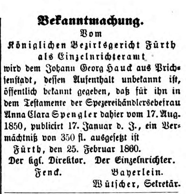 | Beschreibung | Testamentsbekanntmachung Anna Clara Spengler, Fürther Tagblatt 7.3.1860 | ||