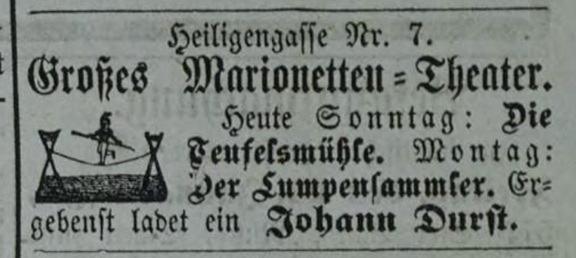 | Beschreibung | Großes Marionetten-Theater von Johann Durst, Jan. 1874 | ||