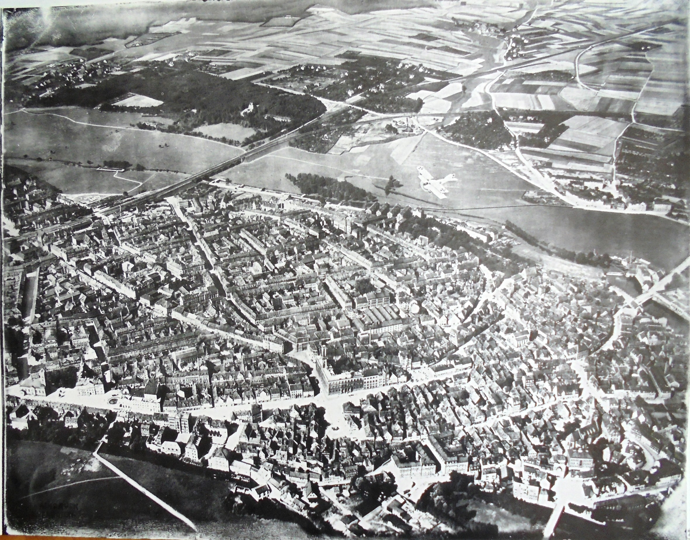 | Beschreibung | Luftbild der Fürther Innenstadt aus dem Jahr 1916 mit hineinretuschiertem Flugzeug (im Wiesengrund Mitte rechts). Mit freundlicher Genehmigung des Geschichtsvereins Fürth e. V. (R. Kimberger) | ||
