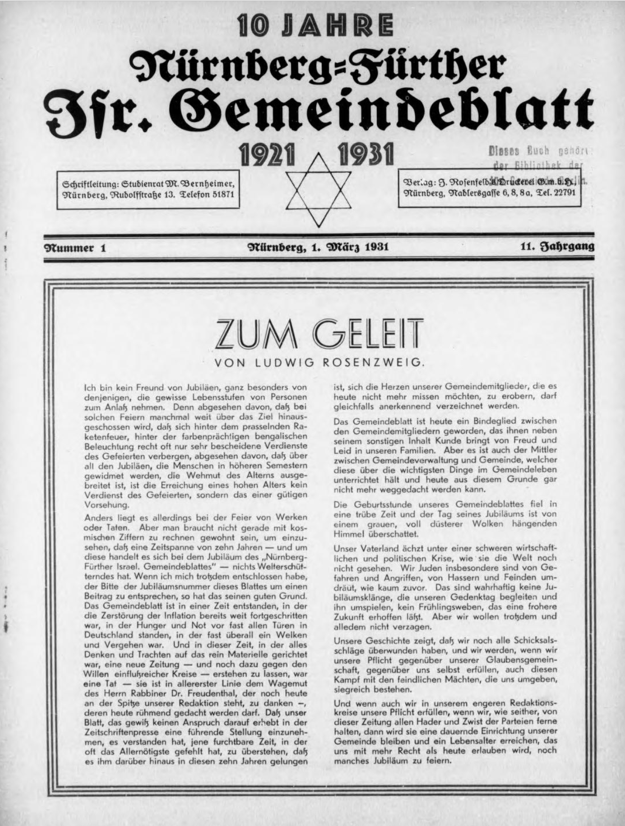 | Beschreibung | 10jährige Jubiläumsausgabe Nürnberg-Fürther Isr. Gemeindeblatts, 1. März 1931 | ||
