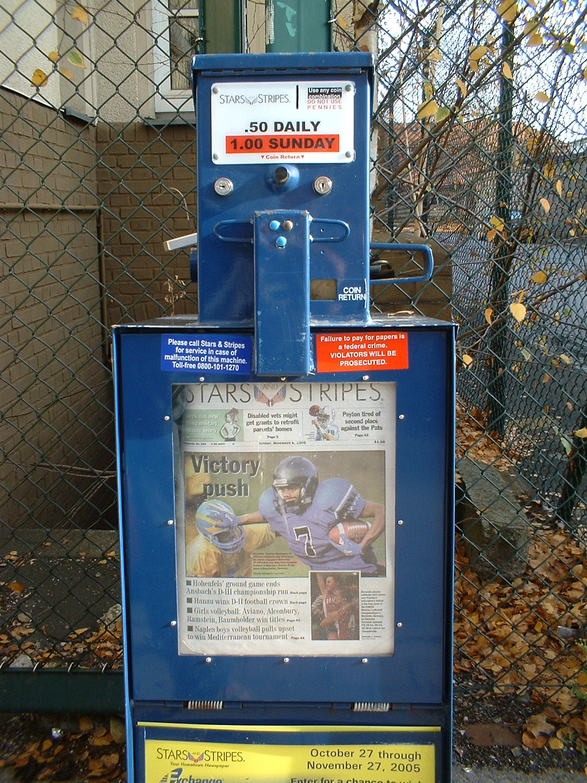Zeitungsautomat mit der US-amerikanischen Armeezeitung "Stars and Stripes" an der Steubenstraße Urheber: Ralph Stenzel<br>Erstellungsdatum: 6. November 2005<br>Lizenz: cc-by-sa-3.0
