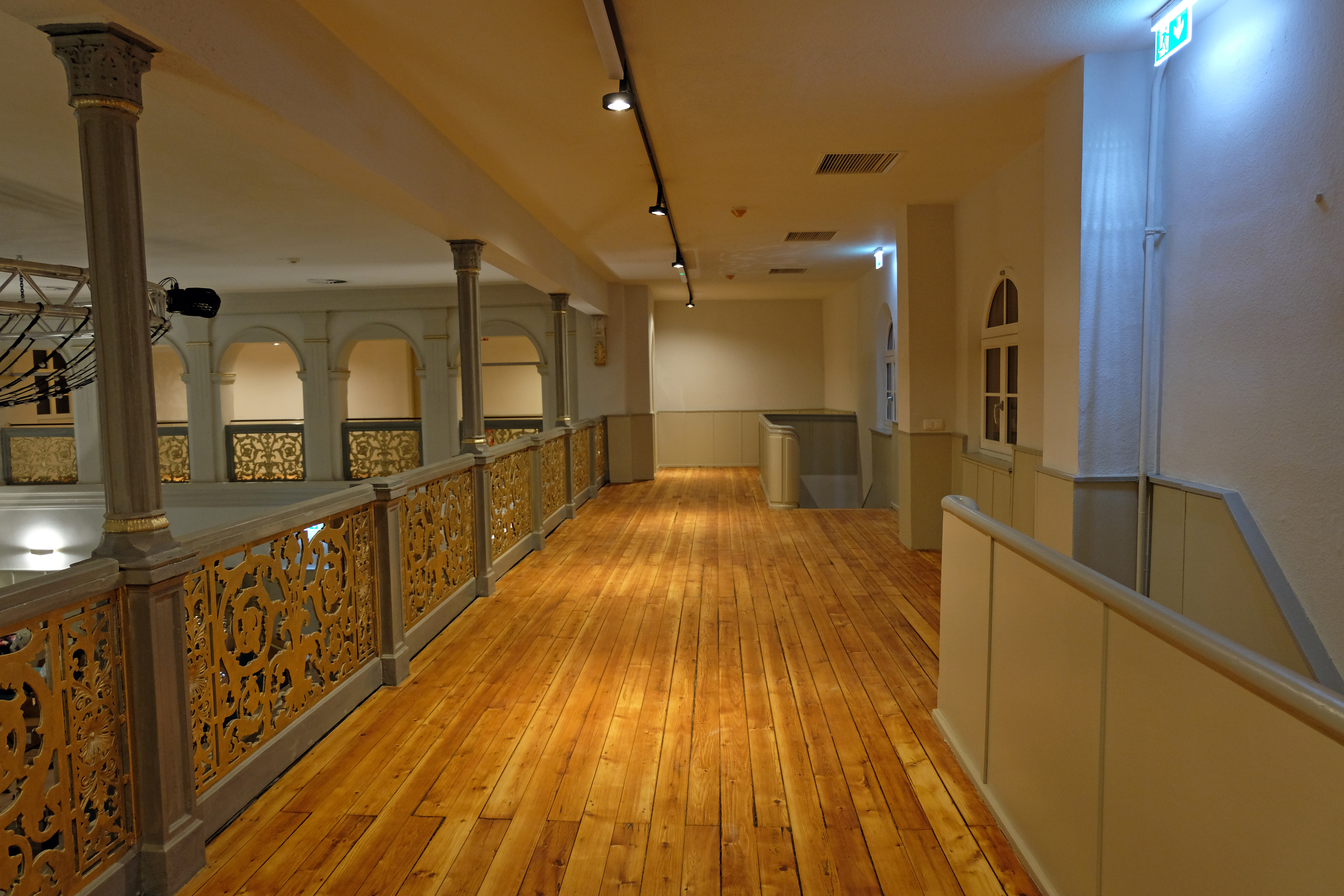 | Dateiinfo (Bild-Unterschrift und Info-Box, automatisch erstellt) | Empore im Festsaal des Grünen Baums, Feb. 2019 Urheber: Kamran Salimi<br>Erstellungsdatum: 9. Februar 2019<br>Lizenz: cc-by-sa-3.0 | ||