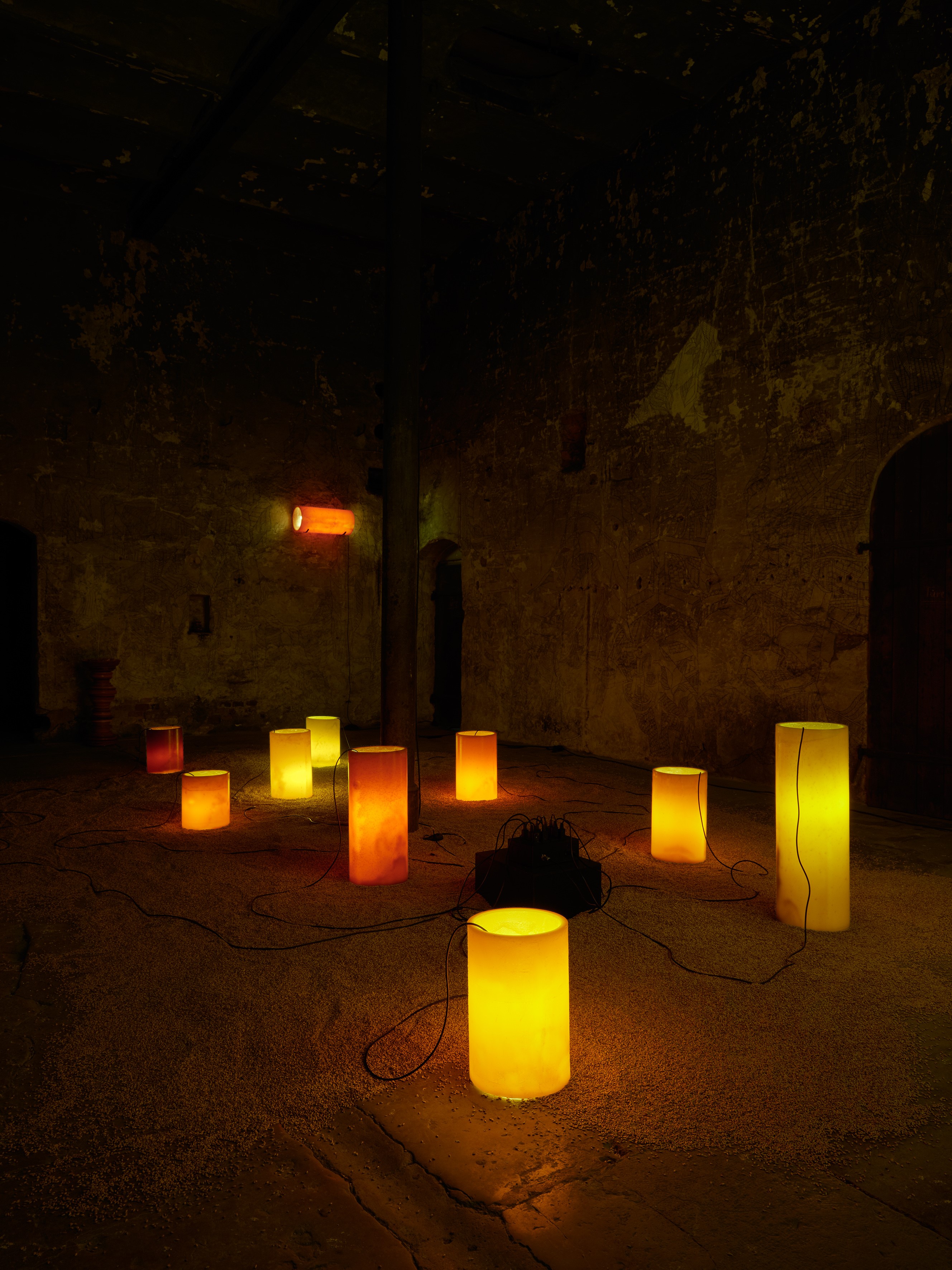 | Beschreibung | Inge Gutbrod: "take a bath in my light-soaked bodies!" (Rauminstallation aus elf beleuchteten Wachszylindern im Rahmen der Kunst-Biennale "ortung 12") | ||