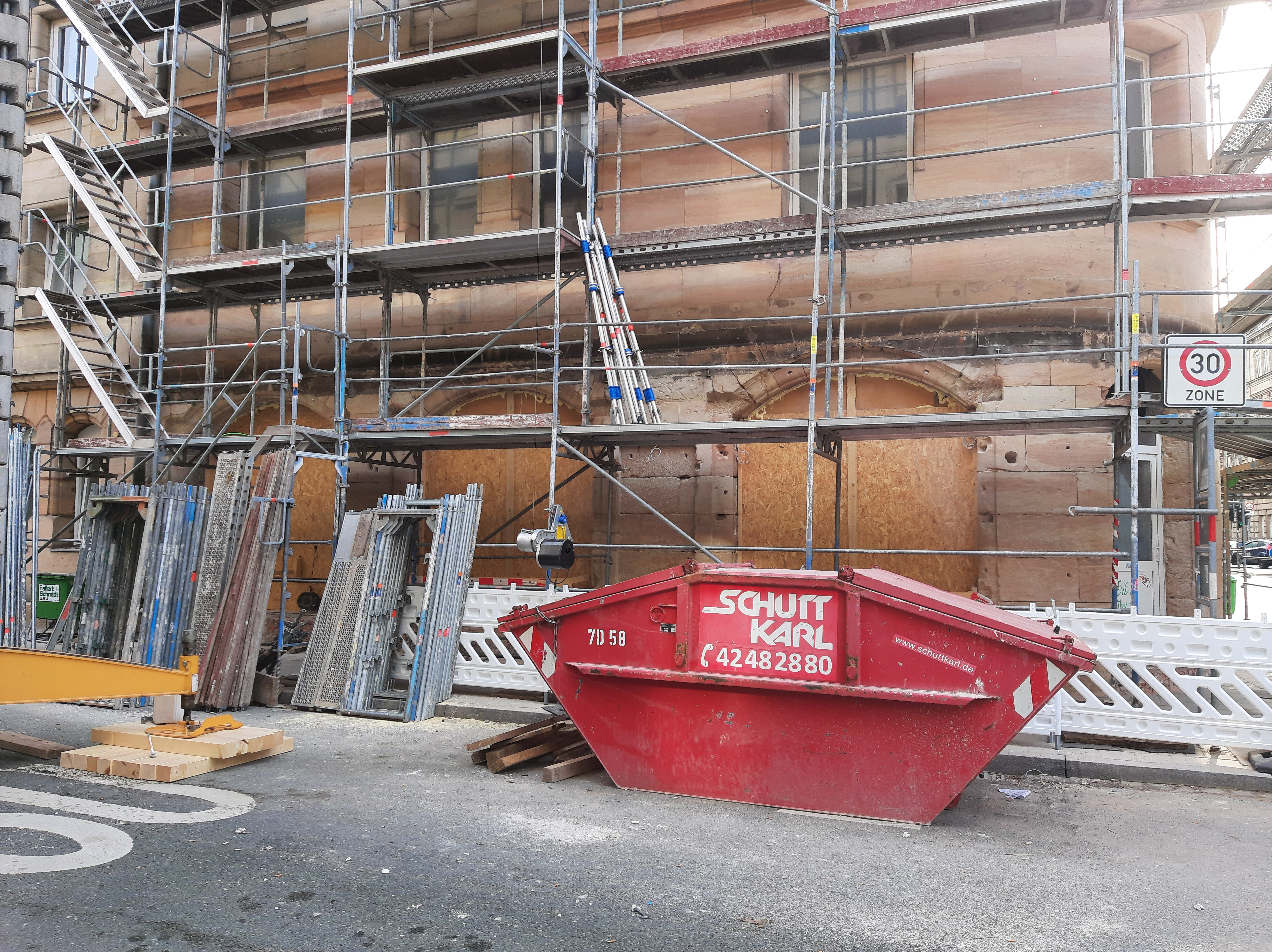 | Beschreibung | Schwabacher Straße 65, Erdgeschoss nach Demontage der Nachkriegs-Fassadenverkleidung, März 2024 | ||