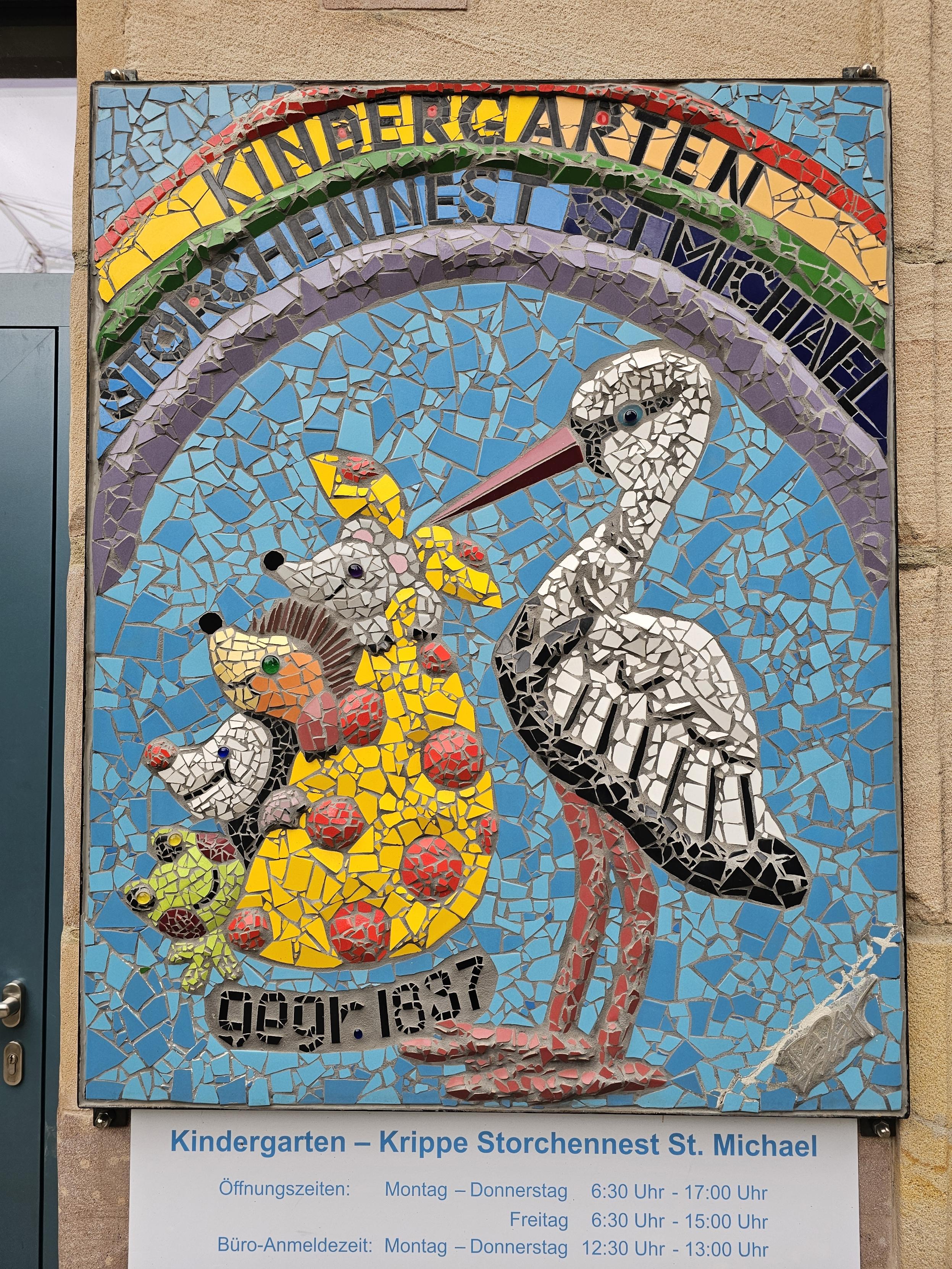 | Beschreibung | Mosaikbild des Evangelischen Kindergartens „Storchennest“ St. Michael der Fürther Künstlerin Iris Rauh, Kirchenplatz 2a, August 2025 | ||