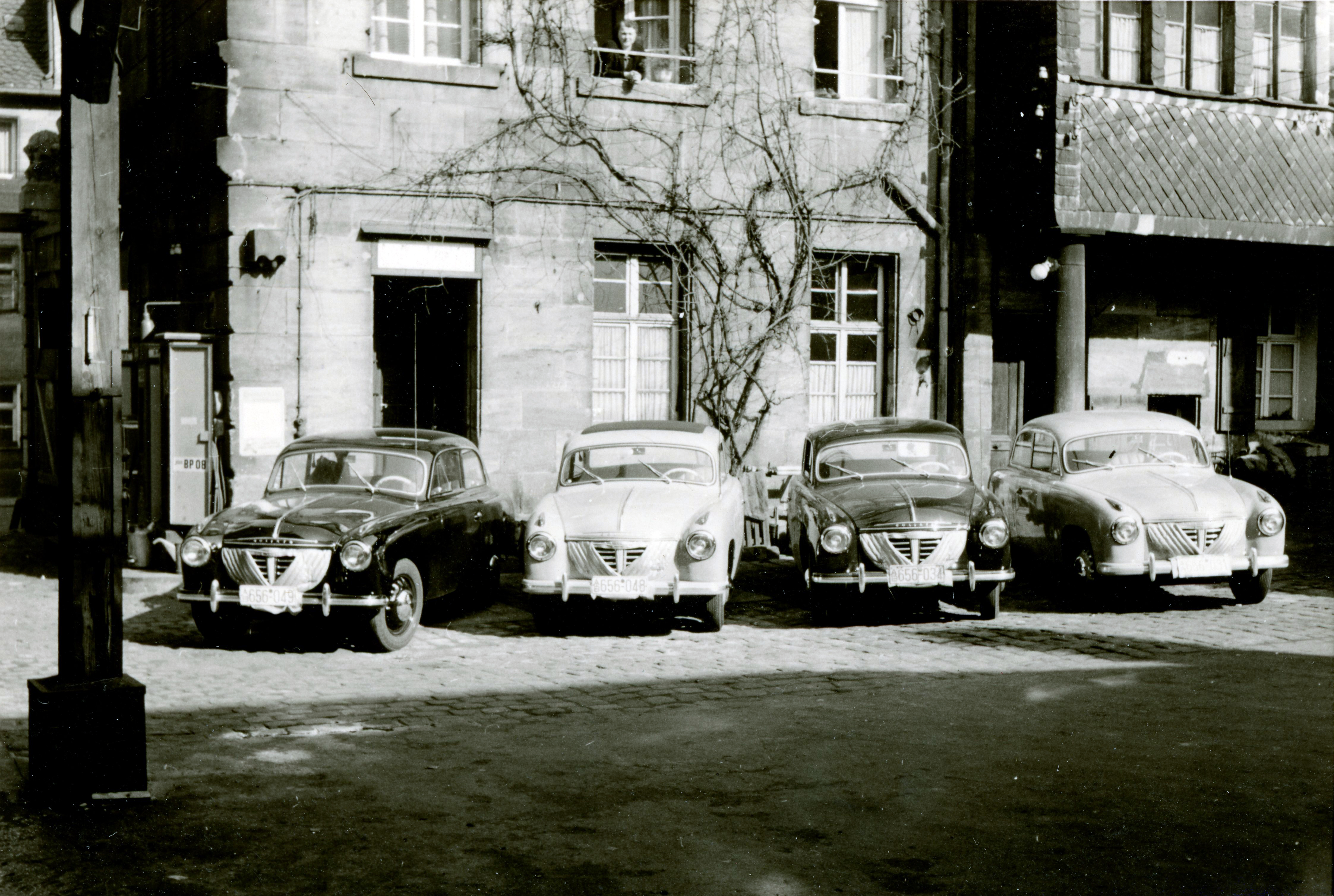 BeschreibungFuhrpark der Familie Georg Friedrich Vogel, Innenhof in der Gartenstraße 9, ca. 1950