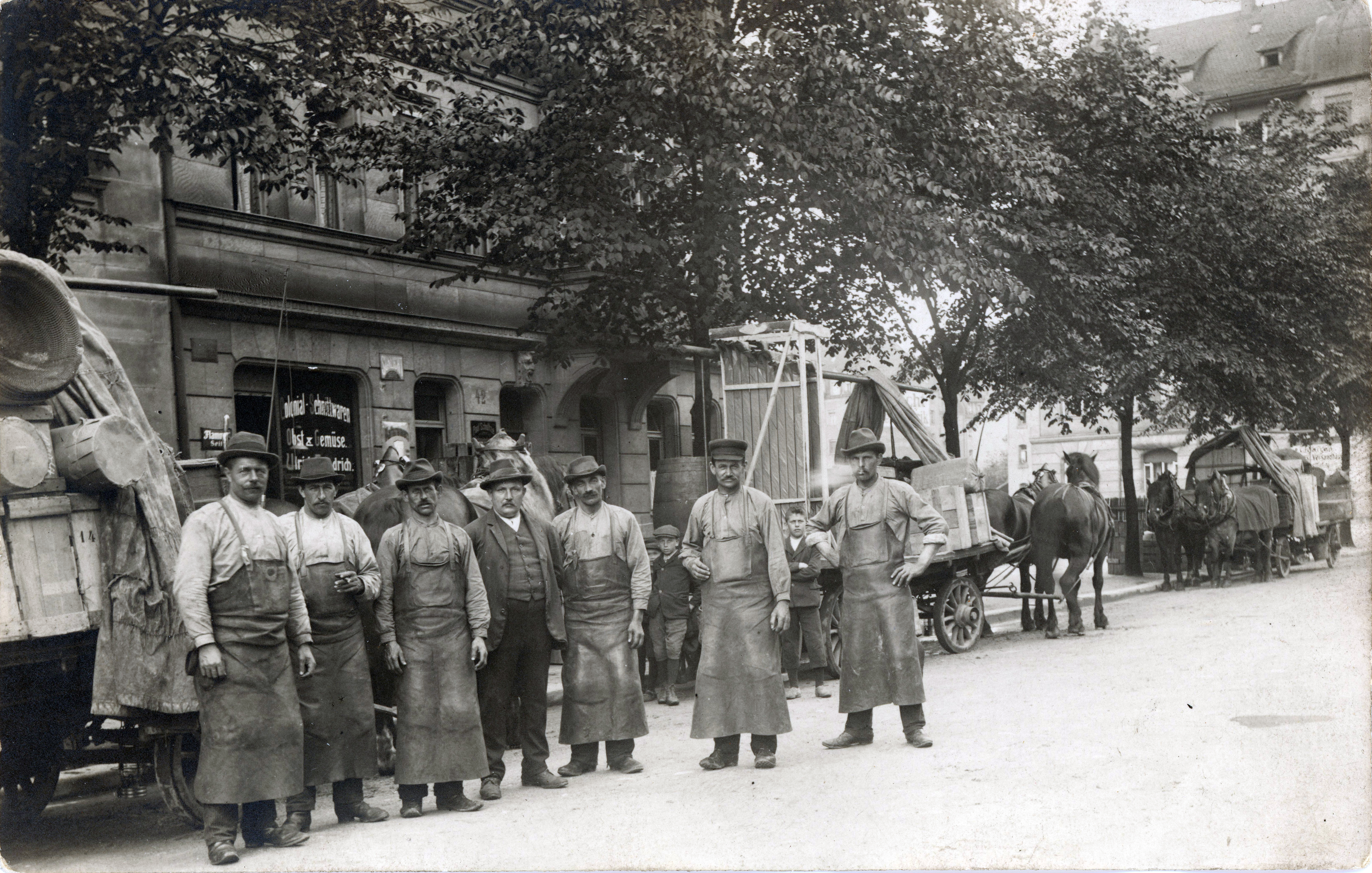 | Beschreibung | Mitarbeiter des Fuhrwerkunternehmens Georg Friedrich Vogel & Söhne, ca. 1890 | ||