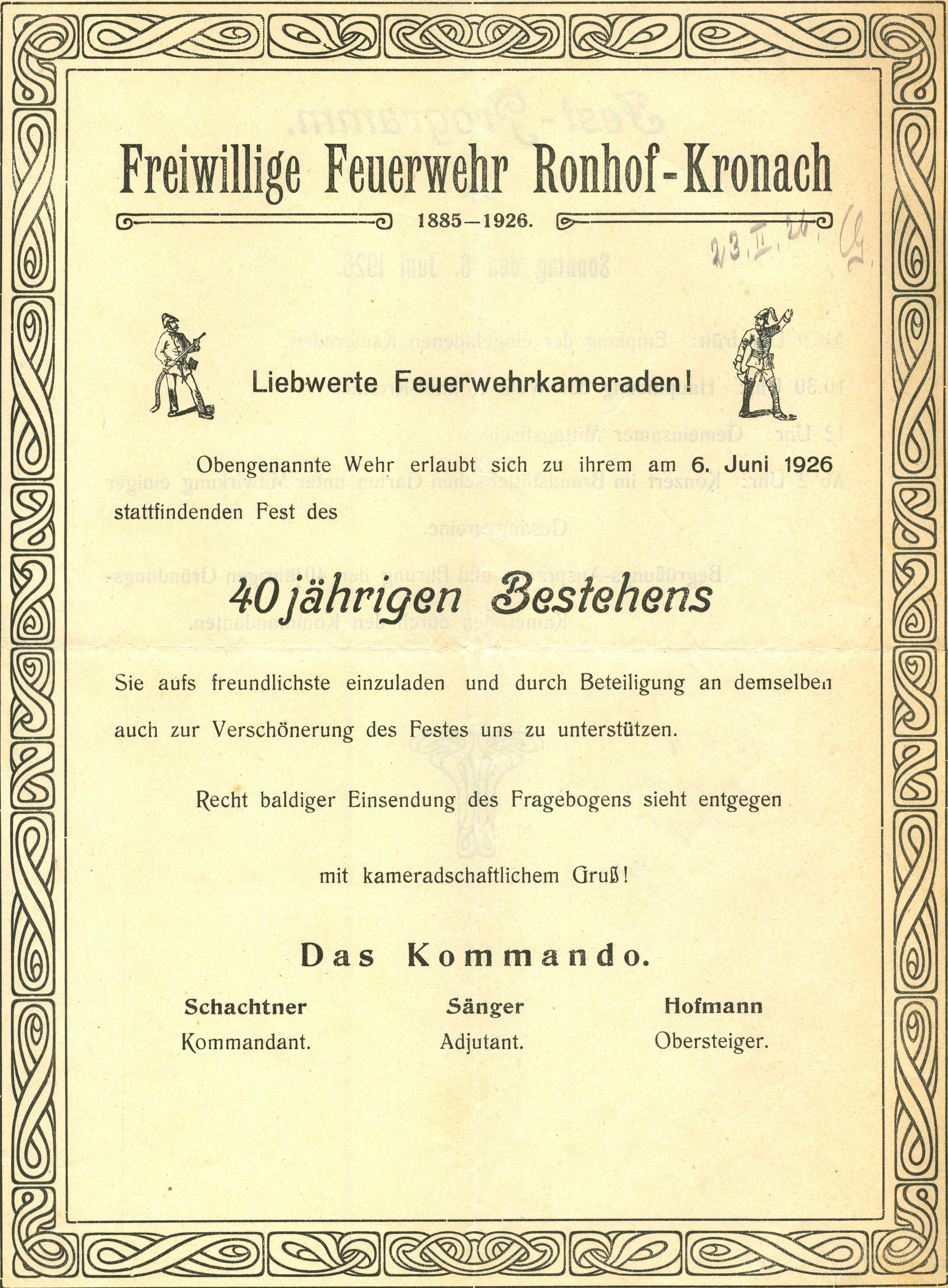 | Dateiinfo (Bild-Unterschrift und Info-Box, automatisch erstellt) | Festeinladung zum 40-jährigen Bestehen der FFW Ronhof-Kronach Urheber: FFW Ronhof-Kronach<br>Erstellungsdatum: 1926<br>Lizenz: cc-by-sa-3.0 | ||