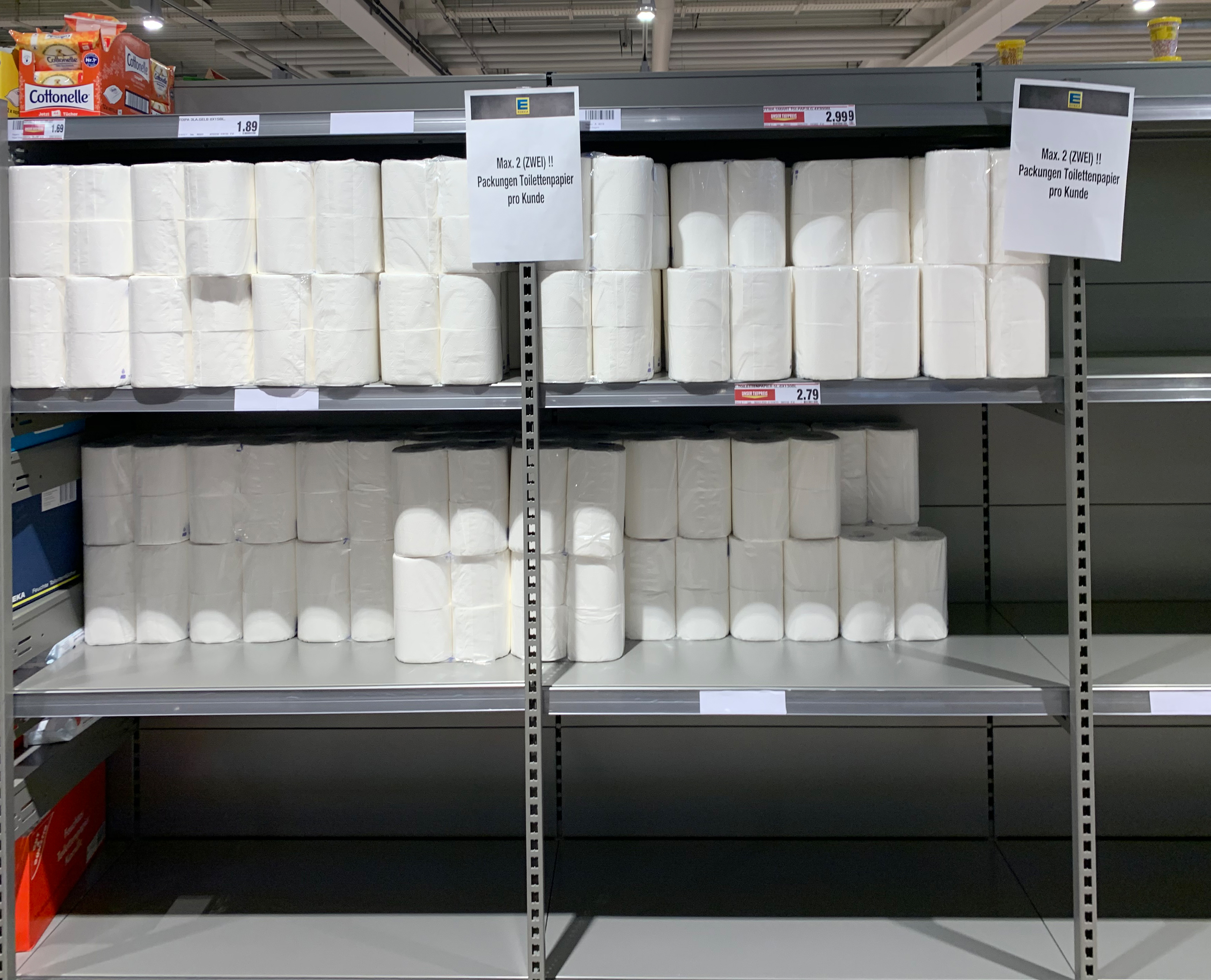| Beschreibung | Nach wie vor ist die Nachfrage nach Klopapier während der COVID-19-Pandemie ungebrochen, die Supermärkte reagieren mit Limitierung und Verteuerung der Preise (4 Rollen = 3 Euro), April 2020 – 17 000. Bild in FürthWiki | ||