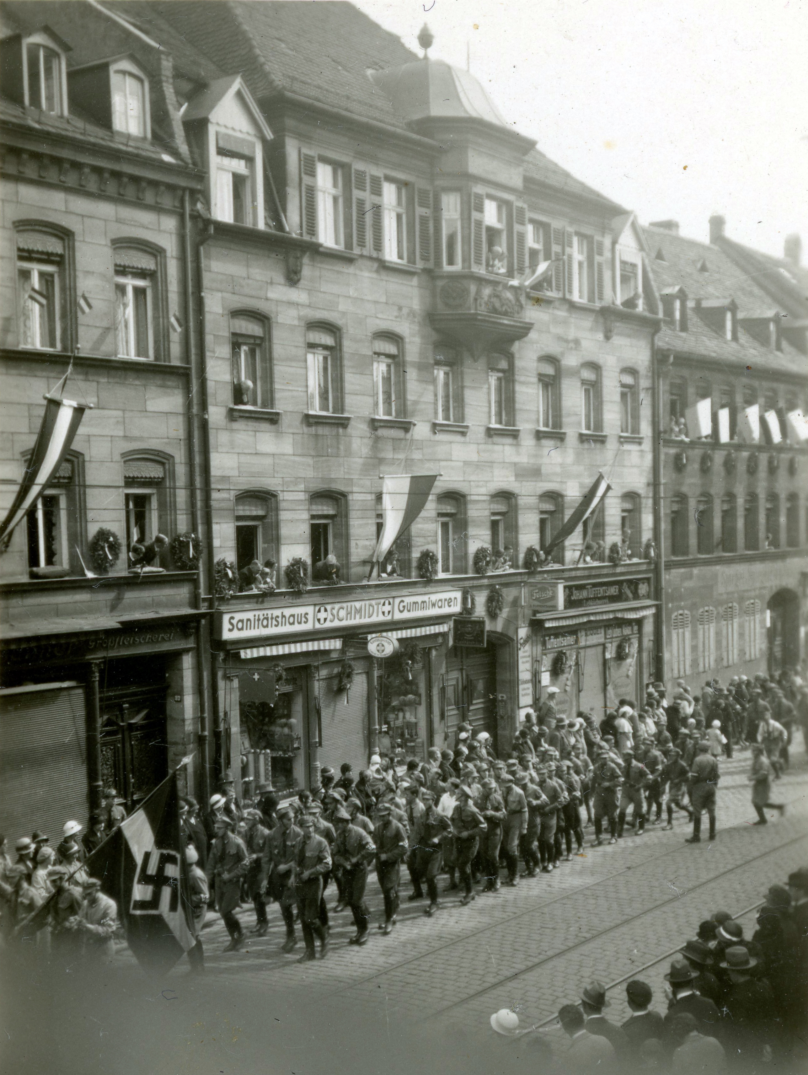 | Beschreibung | Schwabacher Straße 37, 39 und 41 mit dem Sanitätshaus Schmidt und der Lebküchnerei Johann Tuffentsamer während eines Aufmarsches der NSDAP, ca. 1935 | ||