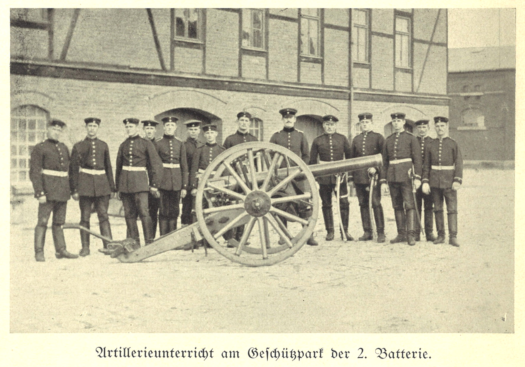 | Beschreibung | Unterricht an einem Geschütz der Artilleriekaserne. Bei dem Gebäude handelt es sich vermutlich um den heute nicht mehr existierenden Geschützschuppen bzw. Waffenmeisterei. Im Hintergrund die Stallung der I. Abteilung an der Sonnenstraße. Aufnahme um 1910 | ||