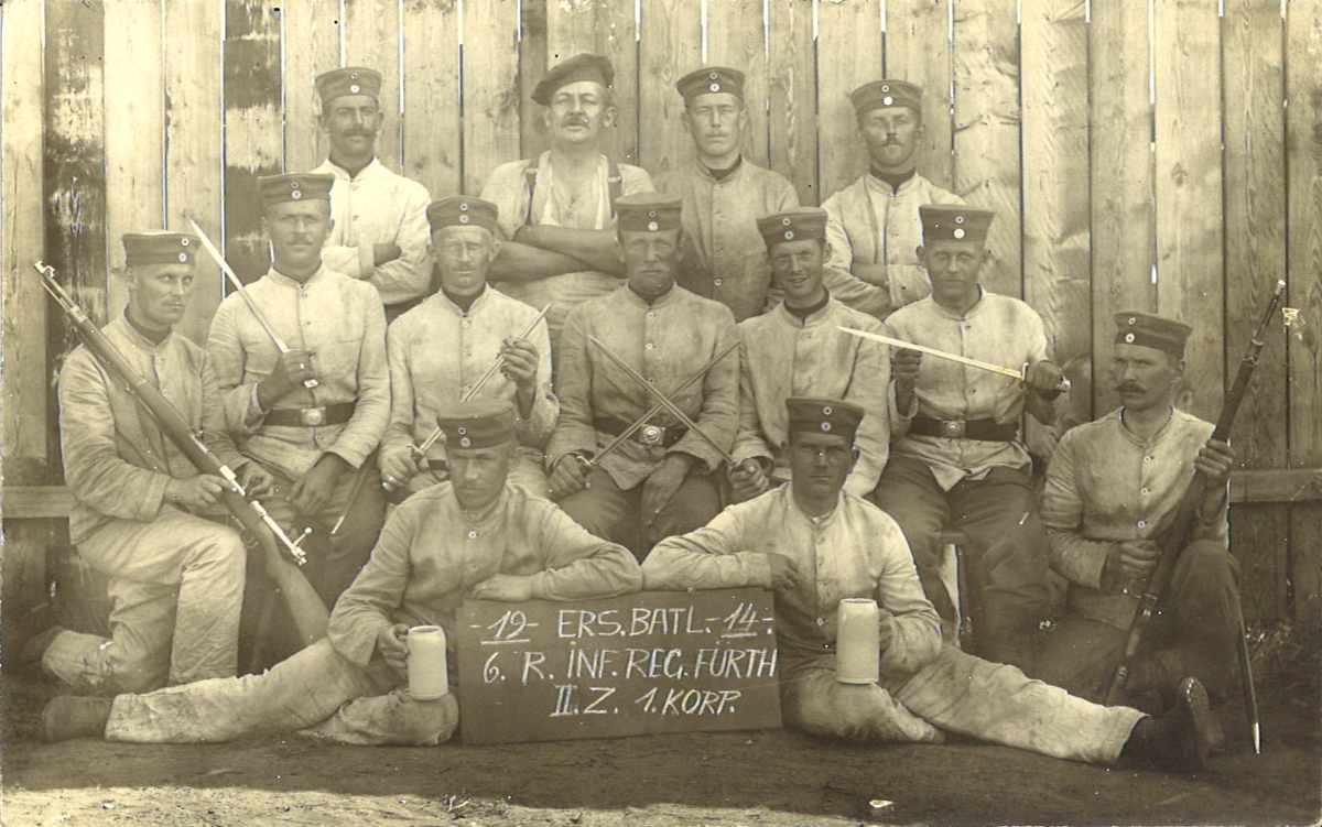 | Dateiinfo (Bild-Unterschrift und Info-Box, automatisch erstellt) | Angehörige des Ersatz-Bataillons des 6. bayerischen Reserve-Infanterie-Regiments in Fürth Urheber: unbekannt<br>Erstellungsdatum: 1914 | ||