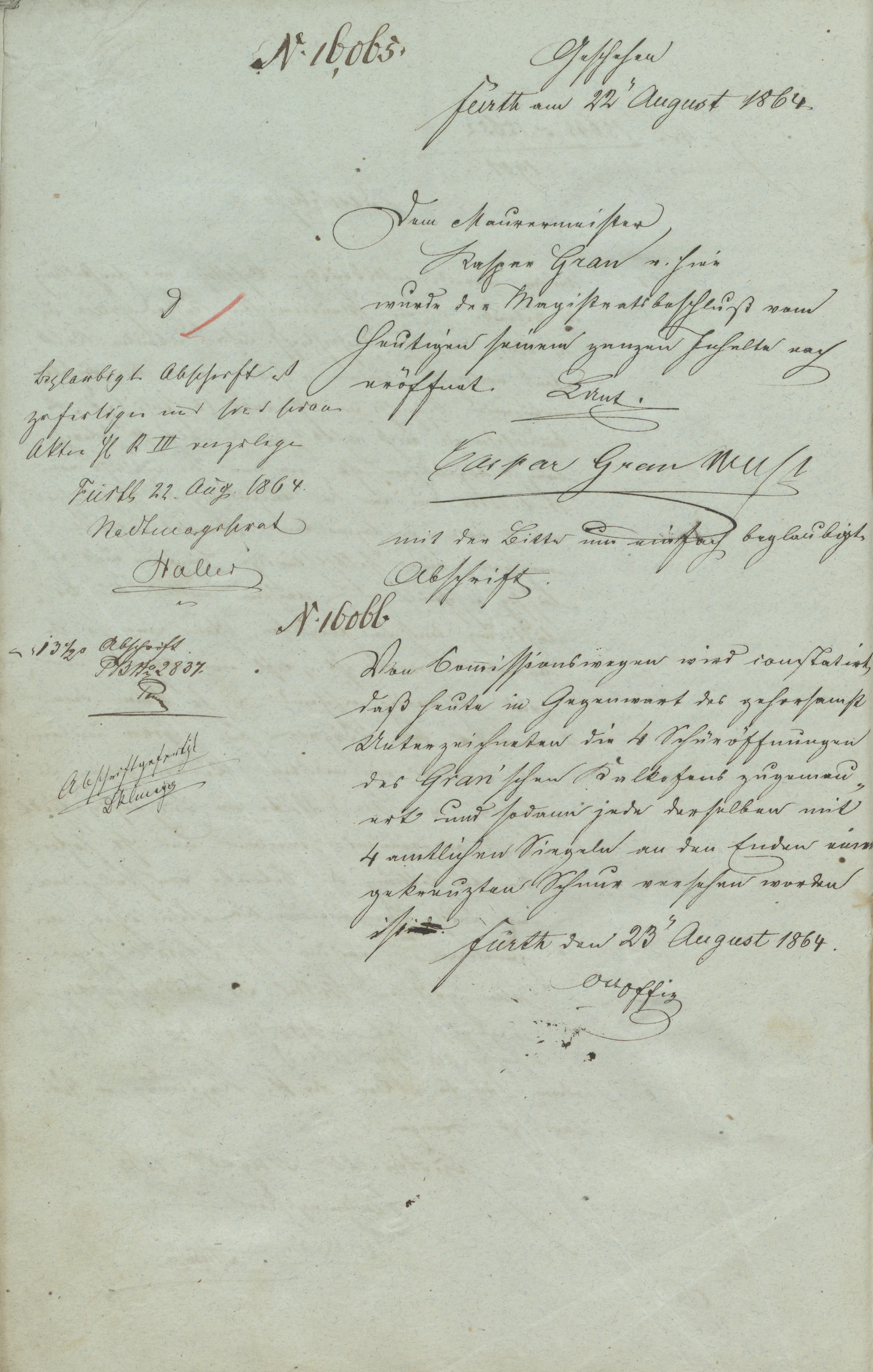 Meldung über das Zumauern der Schüröffnungen vom 23. August 1864; Veröffentlichungsgenehmigung durch das Stadtarchiv Fürth vom 25.09.2019