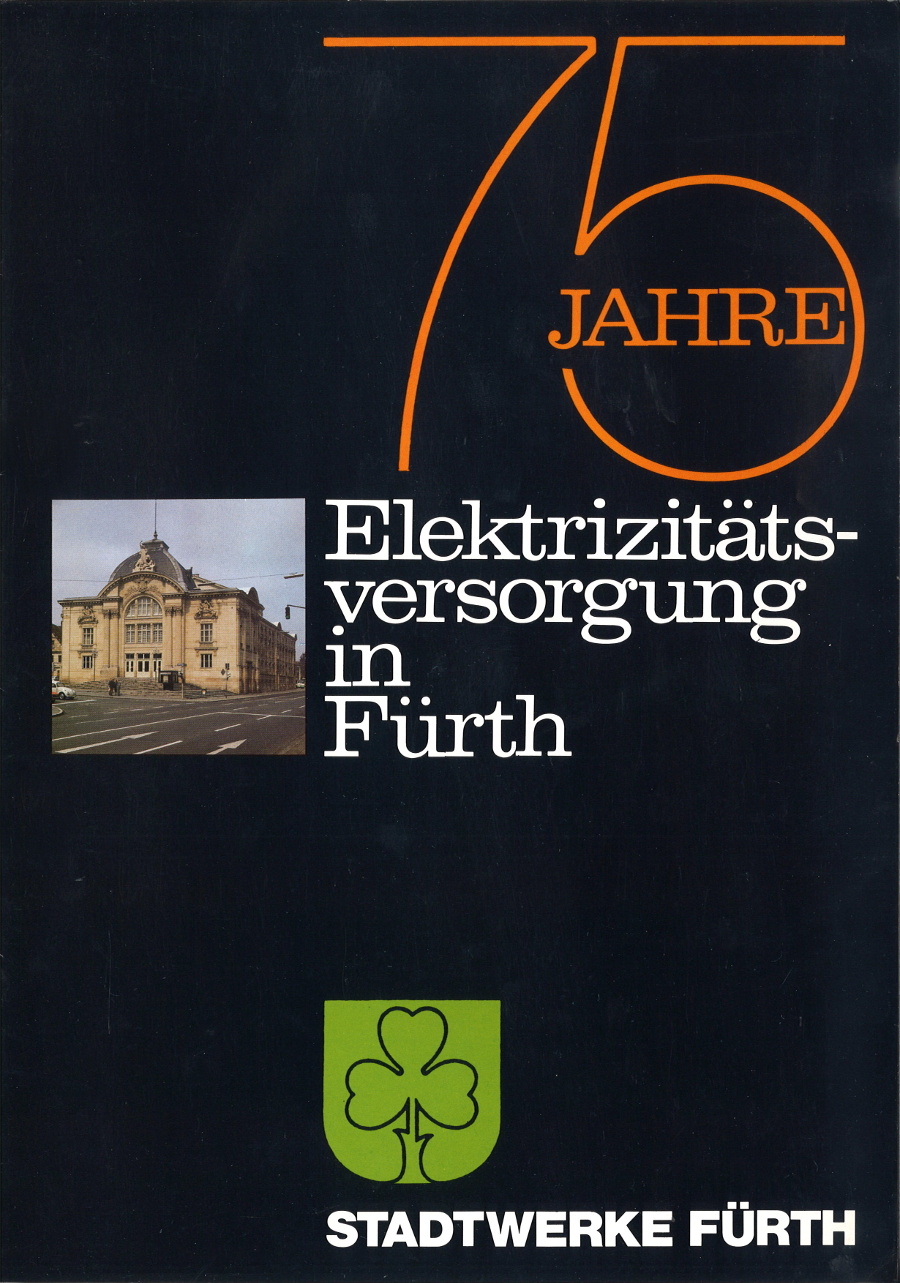 | Dateiinfo (Bild-Unterschrift und Info-Box, automatisch erstellt) | Broschüre 75 Jahre Elektrizitätsversorgung in Fürth - Titelseite Urheber: Stadtwerke<br><br>Lizenz: Copyright | ||