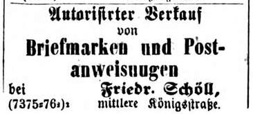 | Beschreibung | Briefmarken u. Postanweisungen bei Schöll, Fürther Abendzeitung, 9. Dezember 1871 | ||
