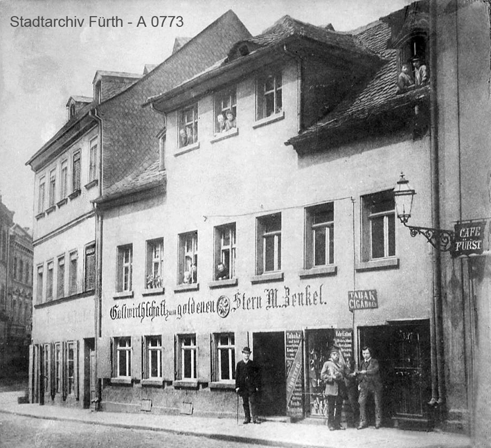 | Dateiinfo (Bild-Unterschrift und Info-Box, automatisch erstellt) | Gastwirtschaft zum goldenen Stern, rechts daneben Café Fürst, Aufnahme vor 1888 Erstellungsdatum: 1887<br>Lizenz: Bildlizenz-Stadtarchiv | ||