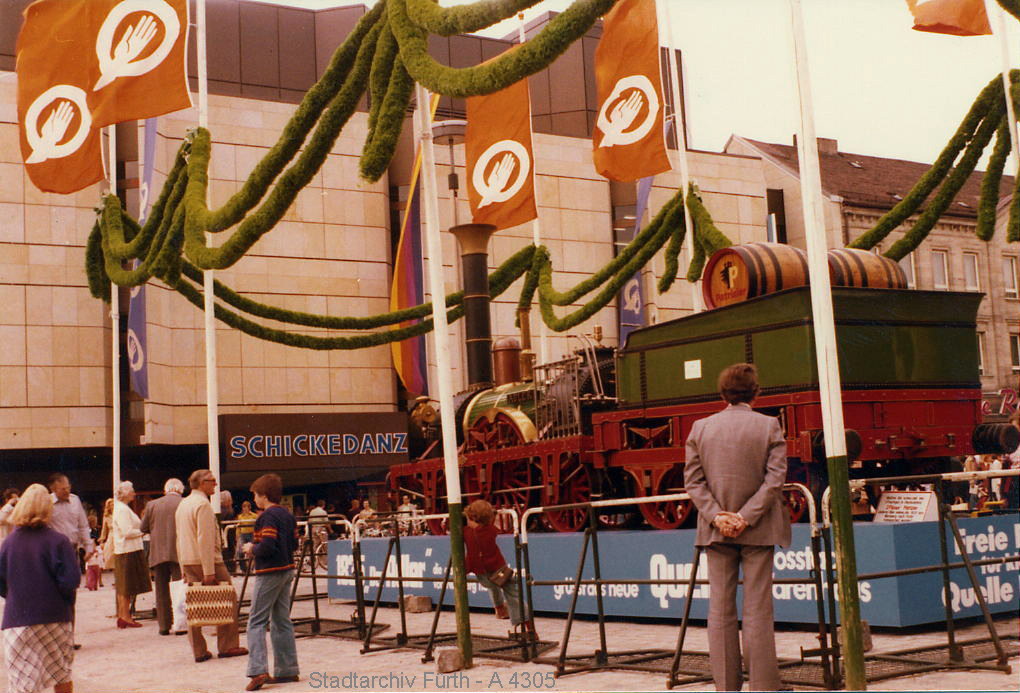 BeschreibungEröffnung des Quelle Kaufhauses. Zur Eröffnung wurde der Nachbau des Adlers auf der Freiheit präsentiert, Sept. 1977