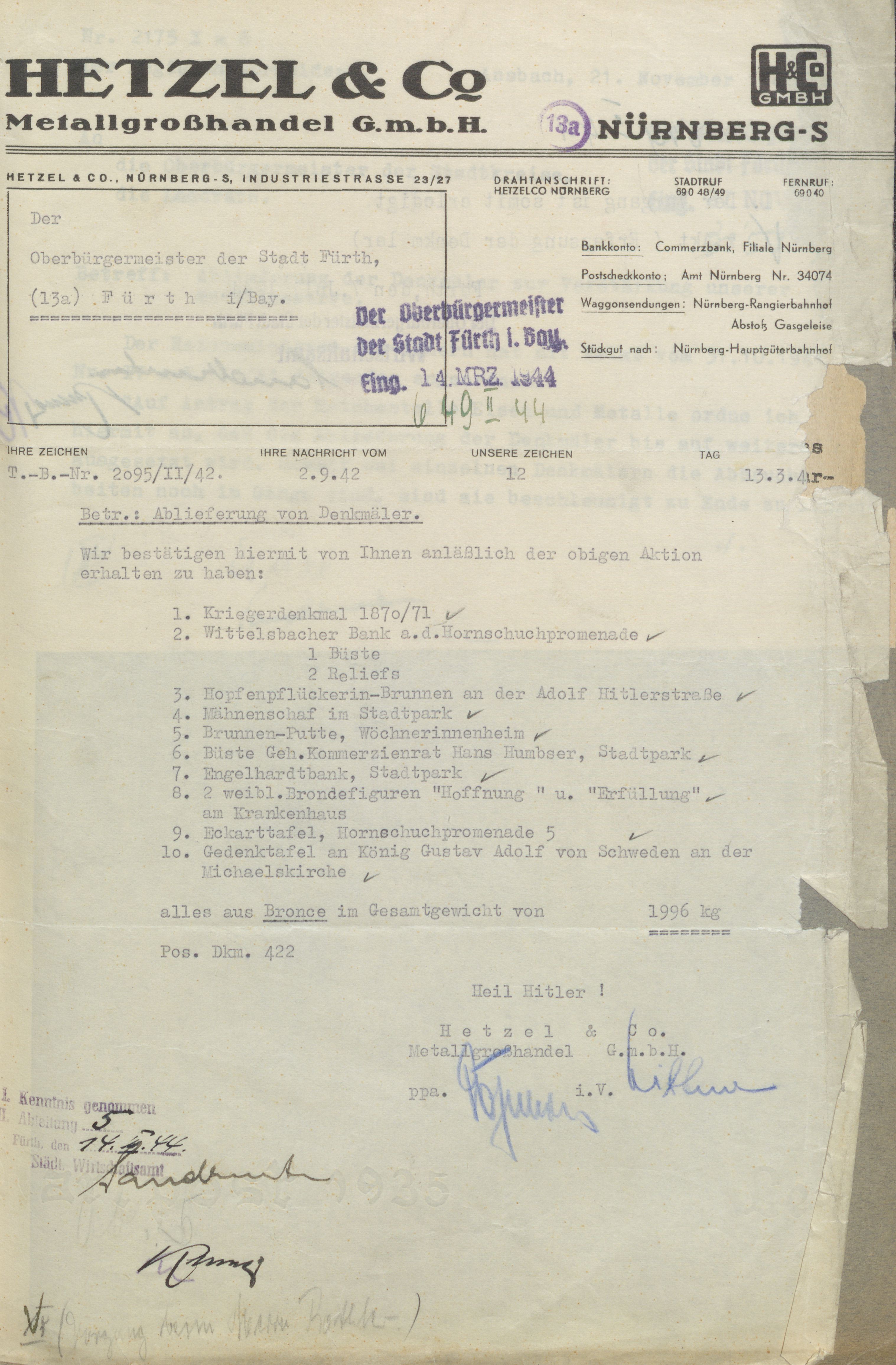 | Dateiinfo (Bild-Unterschrift und Info-Box, automatisch erstellt) | Bestätigung über die Ablieferung der Denkmäler 1944 Urheber: Stadt Fürth<br>Erstellungsdatum: 14. März 1944<br>Lizenz: Bildlizenz-Stadtarchiv | ||