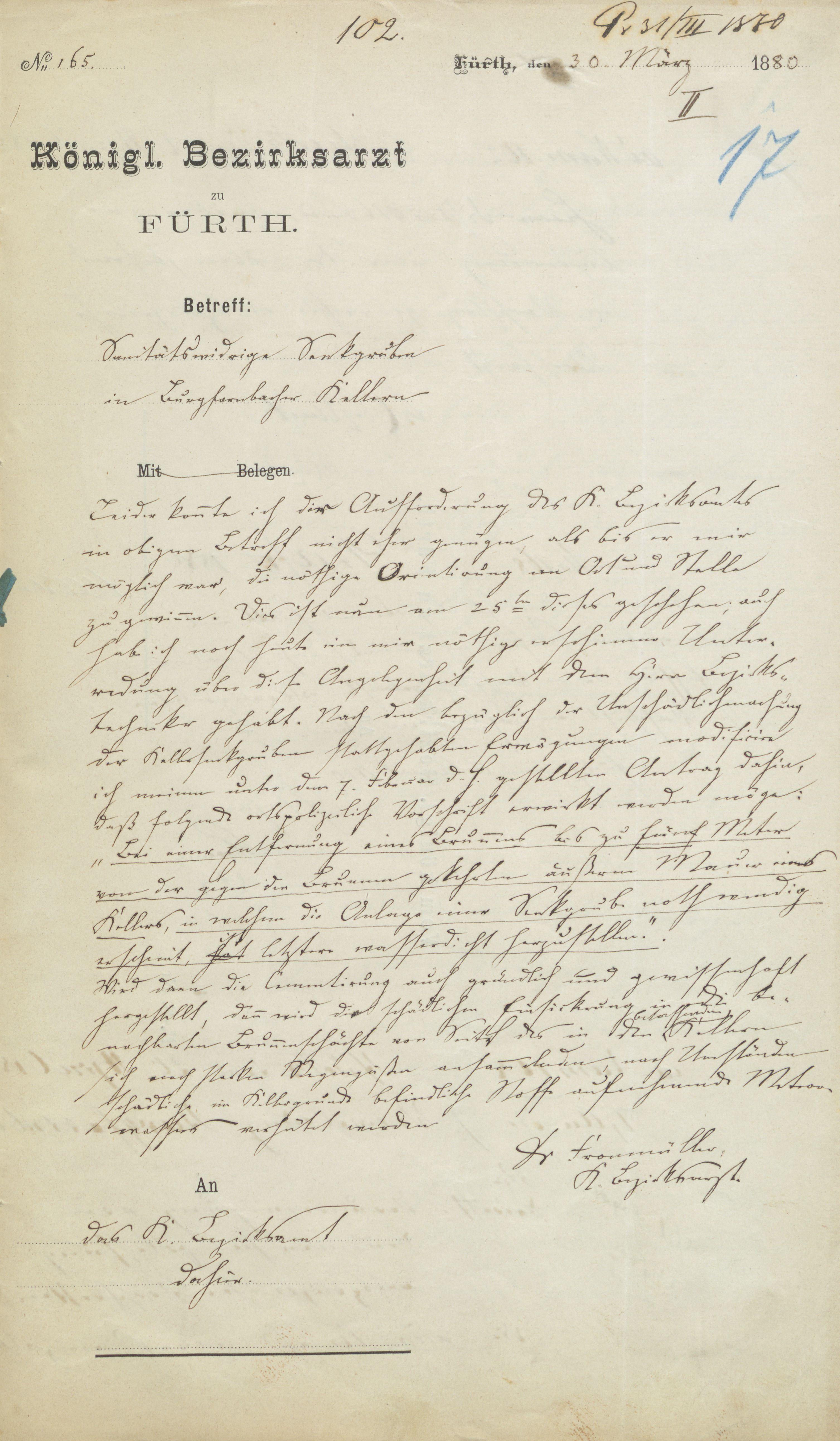| Beschreibung | Bericht des Königlichen Bezirksarztes Dr. Fronmüller vom 30. März 1880 – 13 000. Bild in FürthWiki | ||