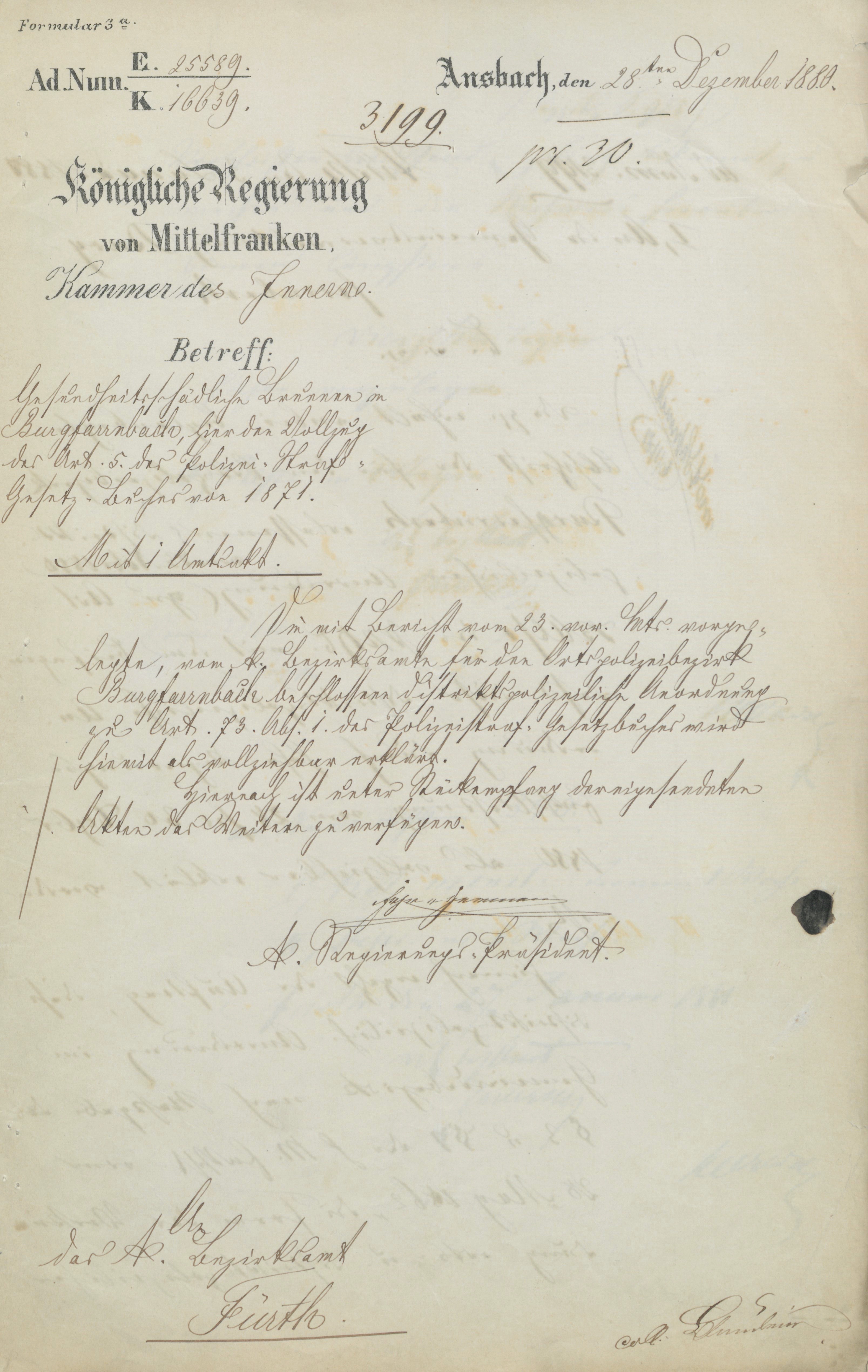 Vollziehbarkeitserklärung der Kgl. Regierung von Mittelfranken vom 28. Dezember 1880; Veröffentlichungsgenehmigung durch das Stadtarchiv Fürth vom 30.04.2019