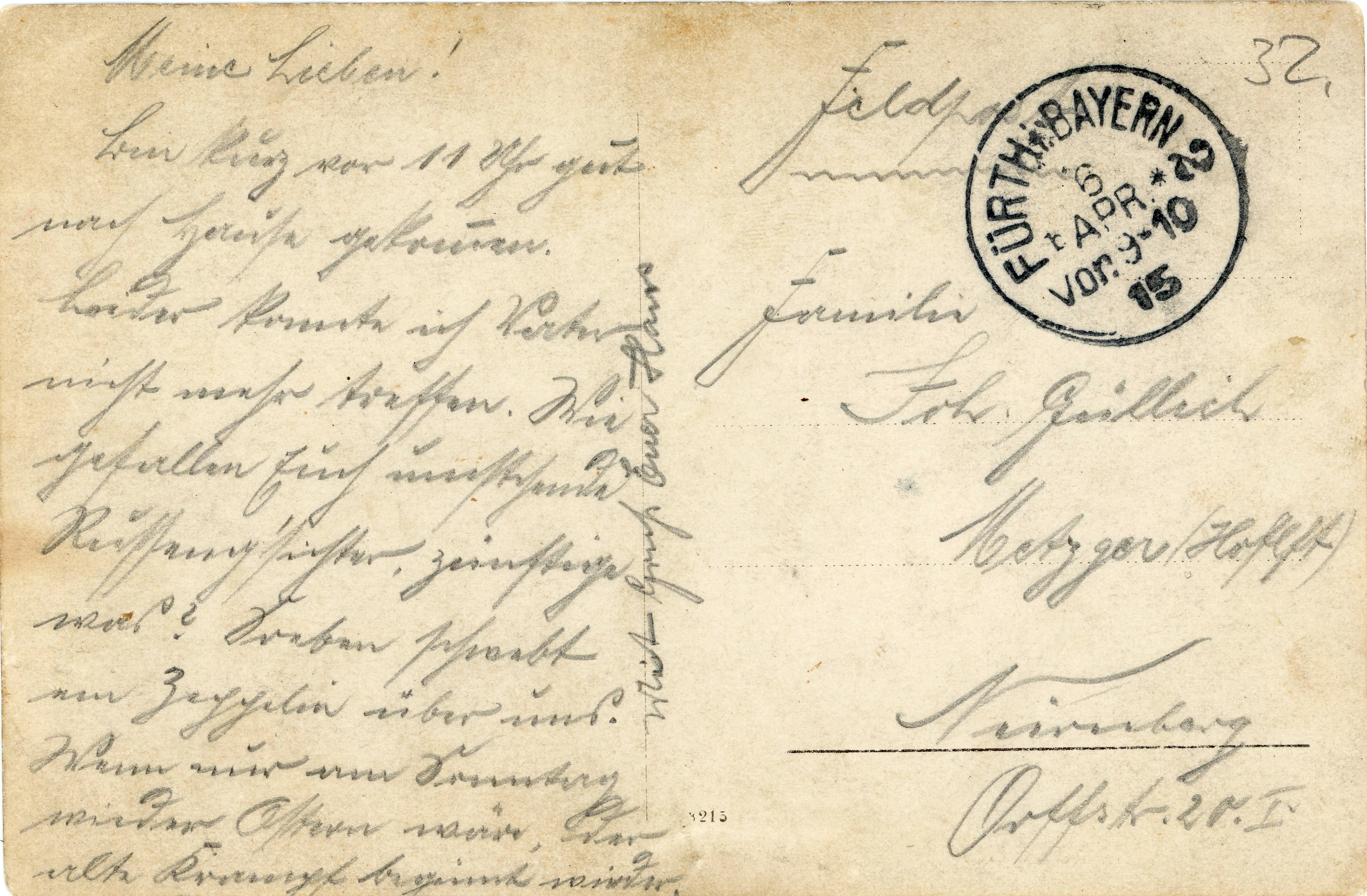 | Beschreibung | Alte Ansichtskarte mit dem Text: "Meine Lieben! Bin kurz vor 11 Uhr gut nach Fürth angekommen. Leider konnte ich Vater nicht mehr treffen. Wie gefallen Euch umstehende Russengsichter, zünftige was? Soeben schwebt ein Zeppelin über uns. Wenn nur am Sonntag wieder Ostern wäre, der alte Krampf beginnt wieder. Liebe Grüße Euer Hans" | ||
