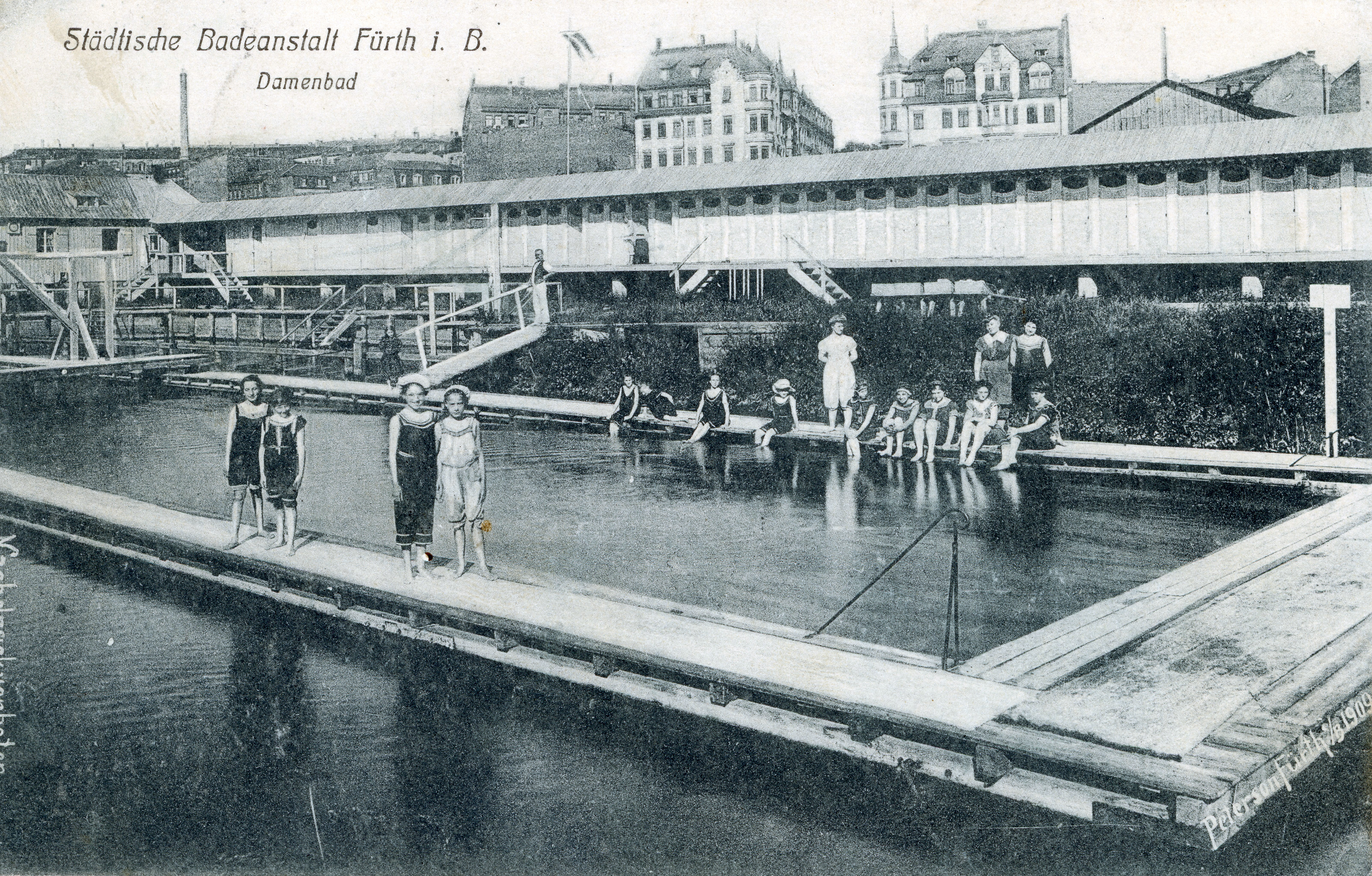 | Dateiinfo (Bild-Unterschrift und Info-Box, automatisch erstellt) | Ansichtskarte vom Damenbad in der Badstraße an der Rednitz, gel. Aug 1909 Urheber: unbekannt<br>Erstellungsdatum: 2. August 1909<br>Lizenz: cc-by-sa-4.0 | ||