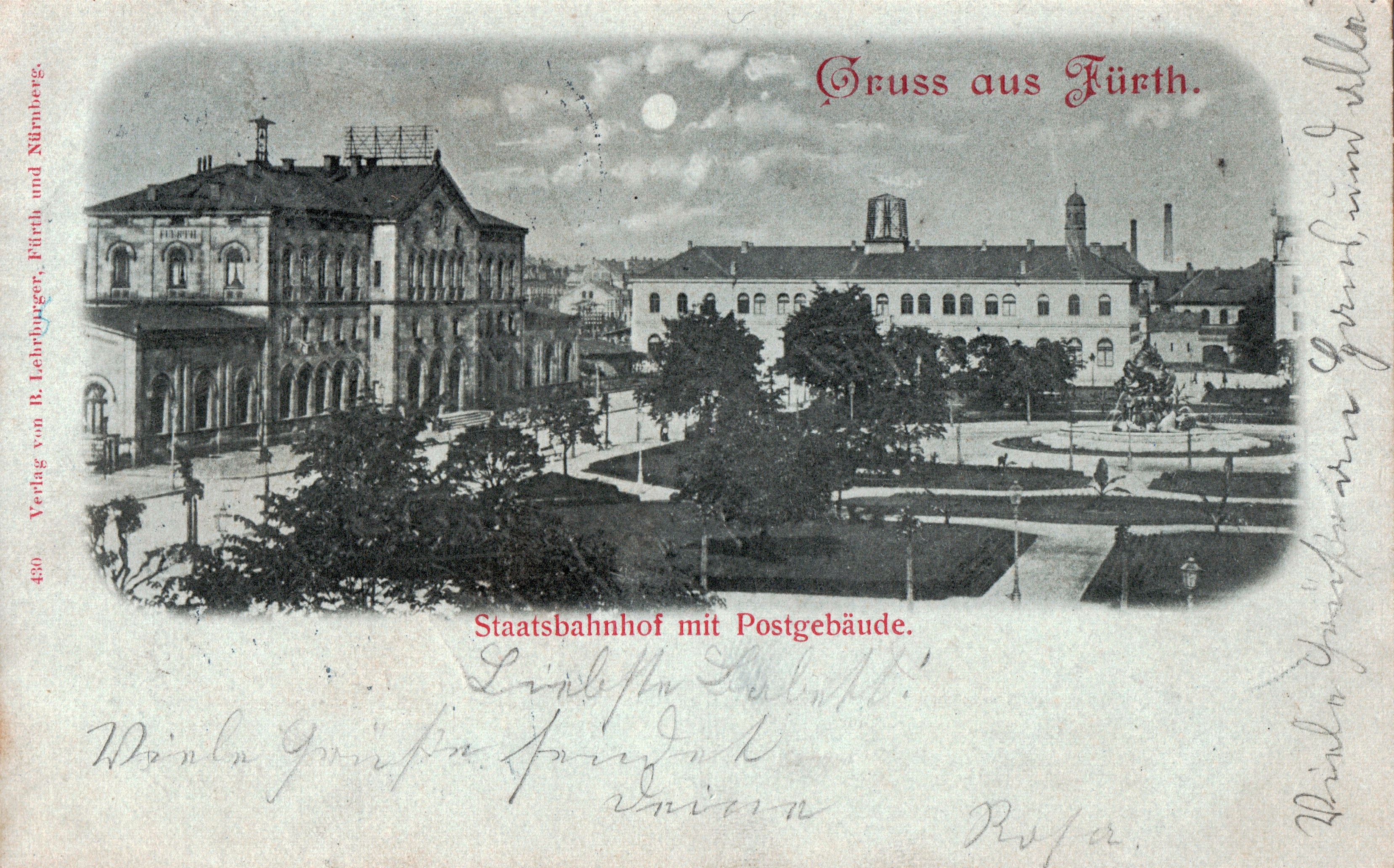 | Dateiinfo (Bild-Unterschrift und Info-Box, automatisch erstellt) | Historische Ansichtskarte "Staatsbahnhof mit Postgebäude", um 1898 Urheber: B. Lehrburger<br>Erstellungsdatum: 1898<br>Über Datum: 1898<br>Lizenz: cc-by-sa-3.0 | ||