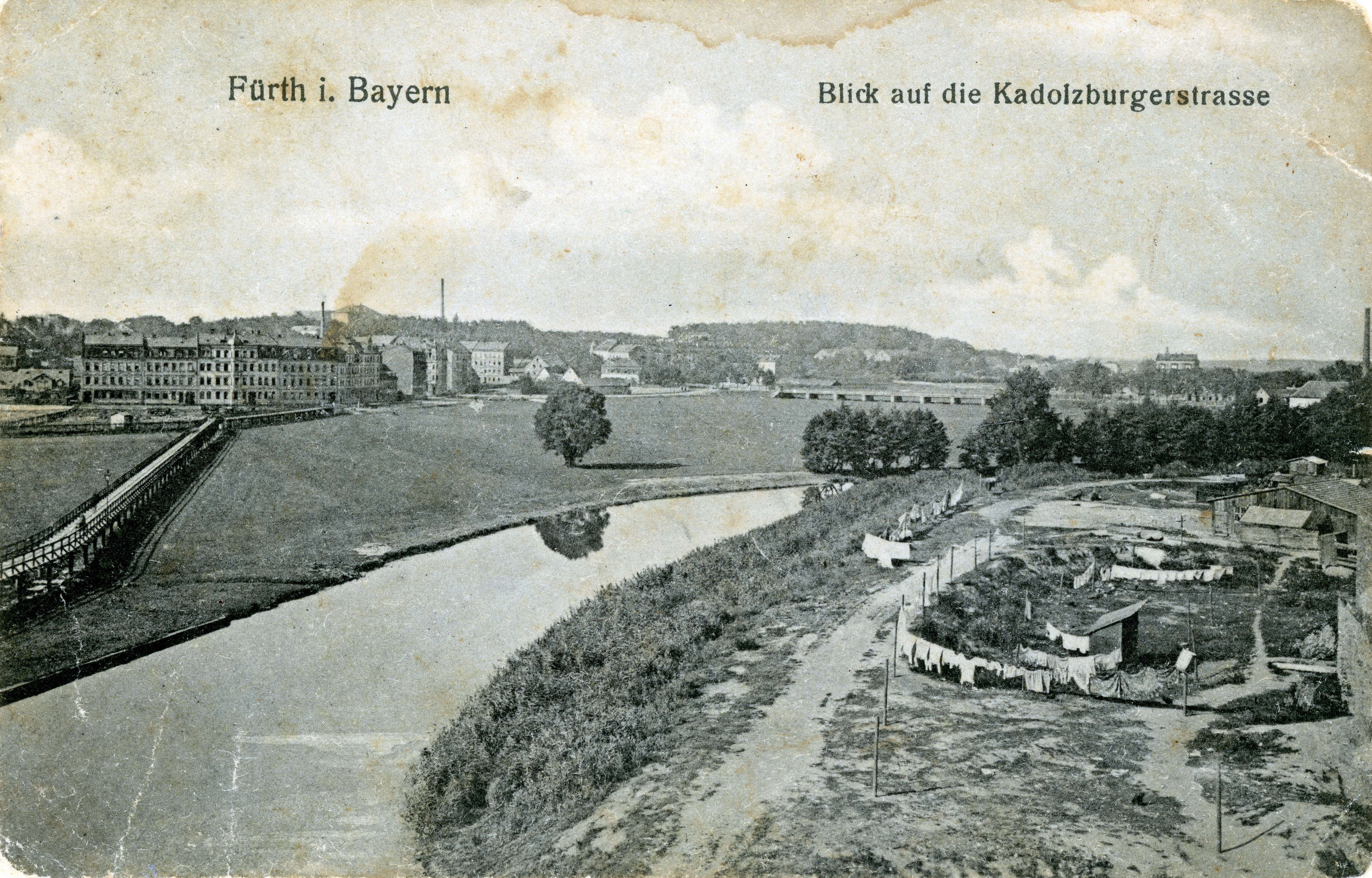 | Beschreibung | Blick über den Wiesengrund der Rednitz, im Vordergrund die heutige Uferpromenade, links der Königswartersteg, im Hintergrund die Cadolzburger Straße, gel. 1908 | ||