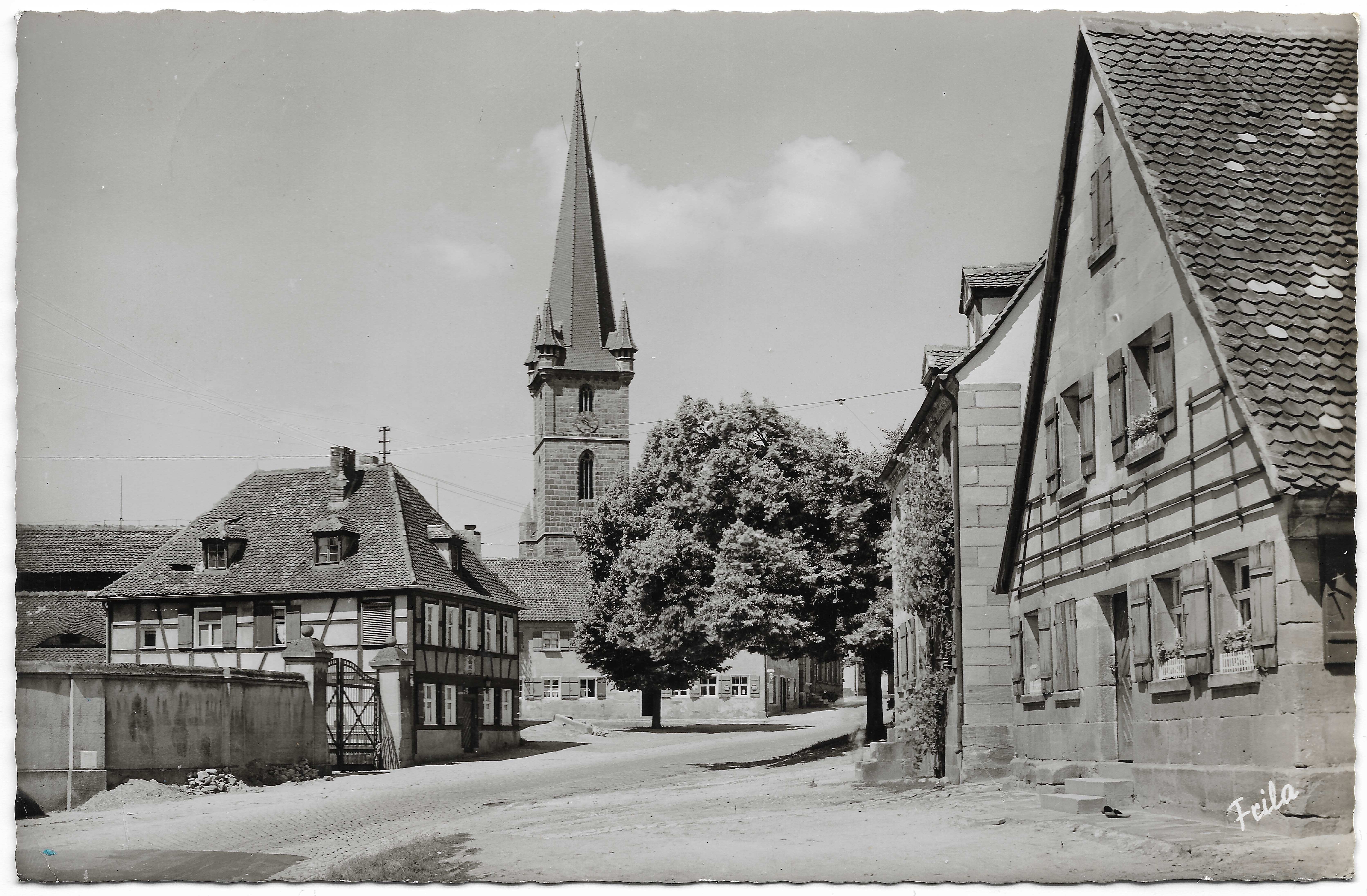| Beschreibung | Ansichtskarte von Burgfarrnbach: Würzburger Straße und Kirche St. Johannis, gel. 1961 | ||