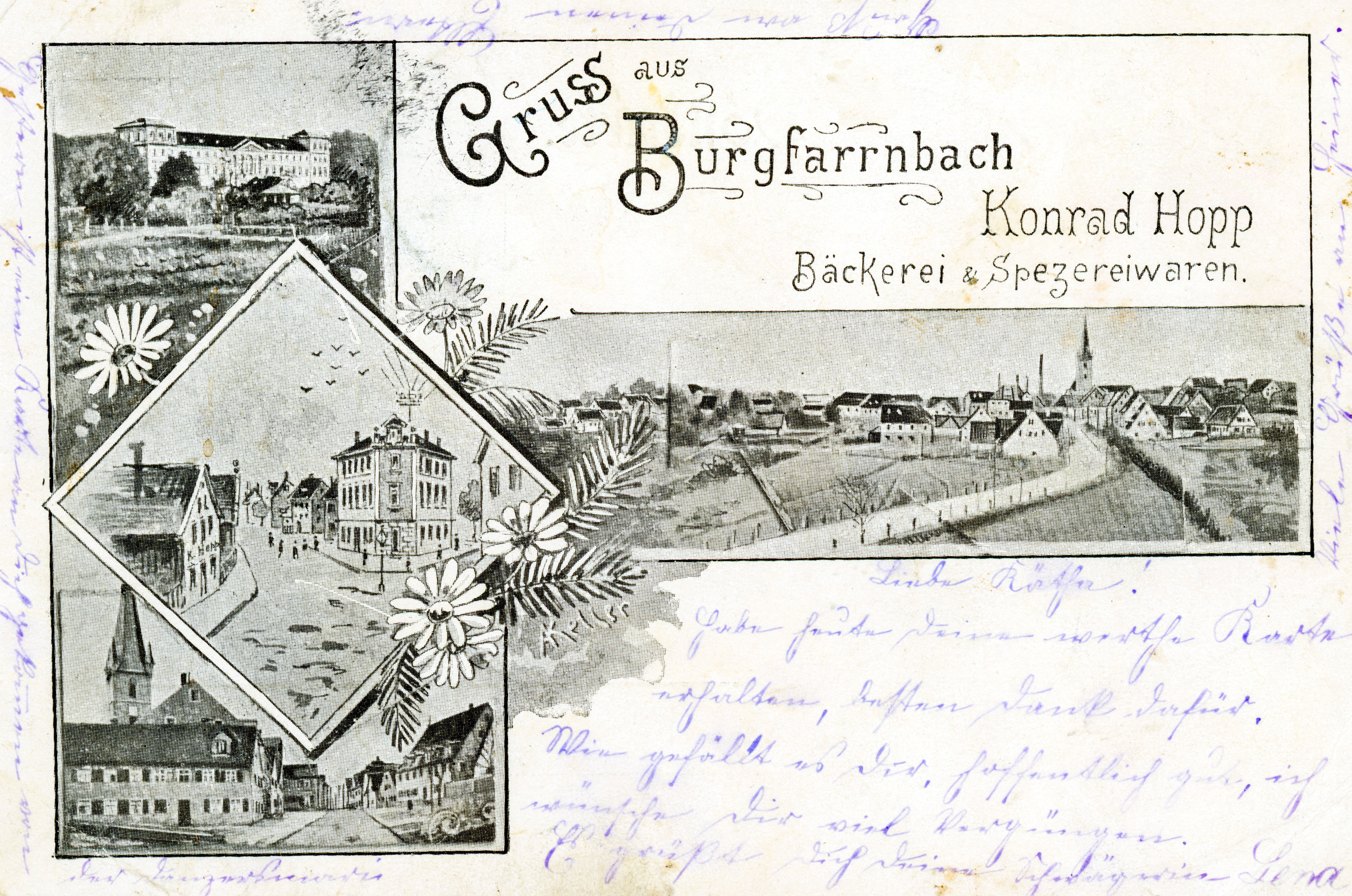 | Beschreibung | Ansichtskarte von Burgfarrnbach von der Bäckerei Konrad Hopp, gel. 1901 | ||