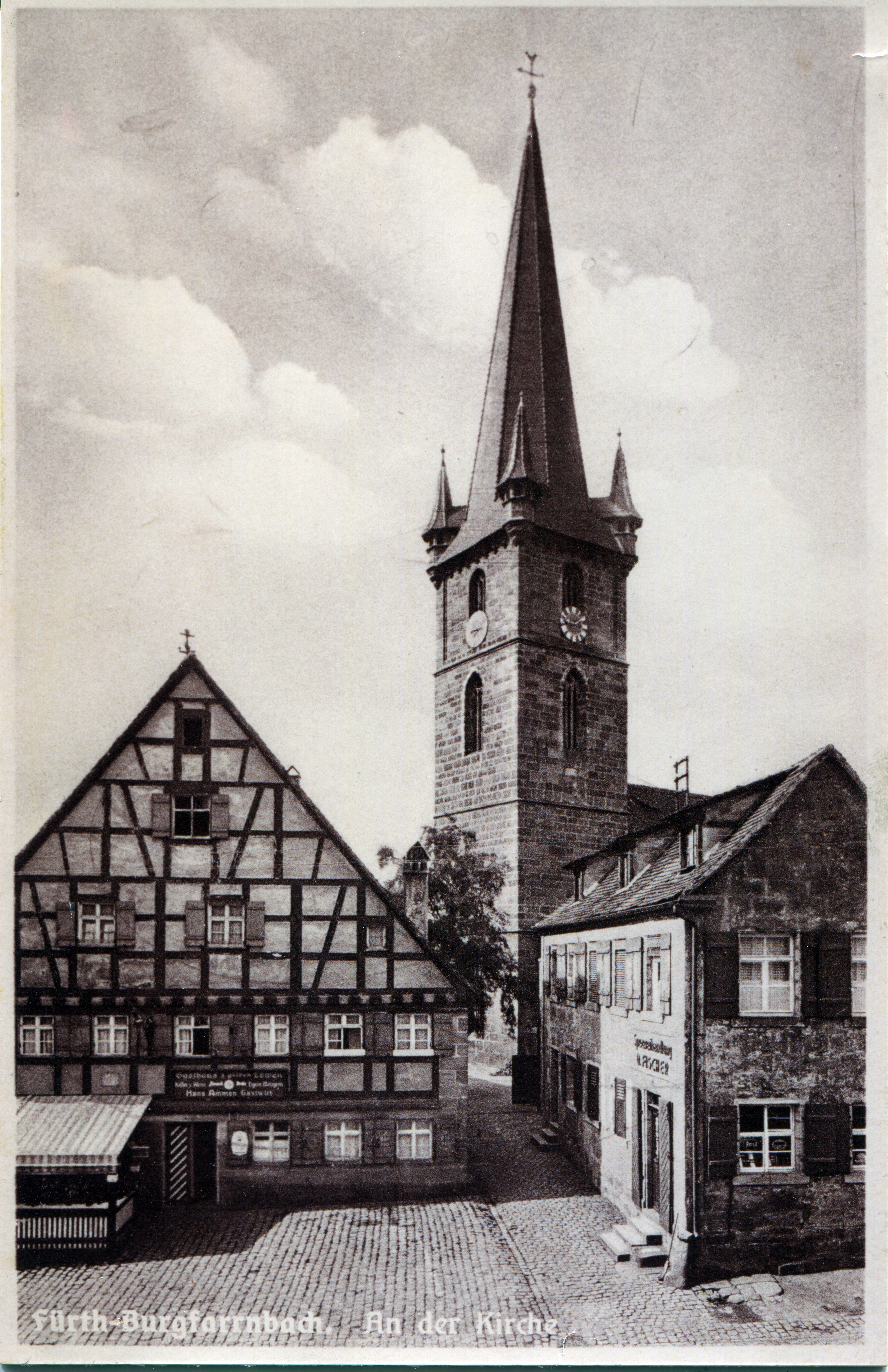 BeschreibungBlick auf die Kirche St. Johannis und Gaststätte Zum Gelben Löwen in Burgfarrnbach, ca. 1950